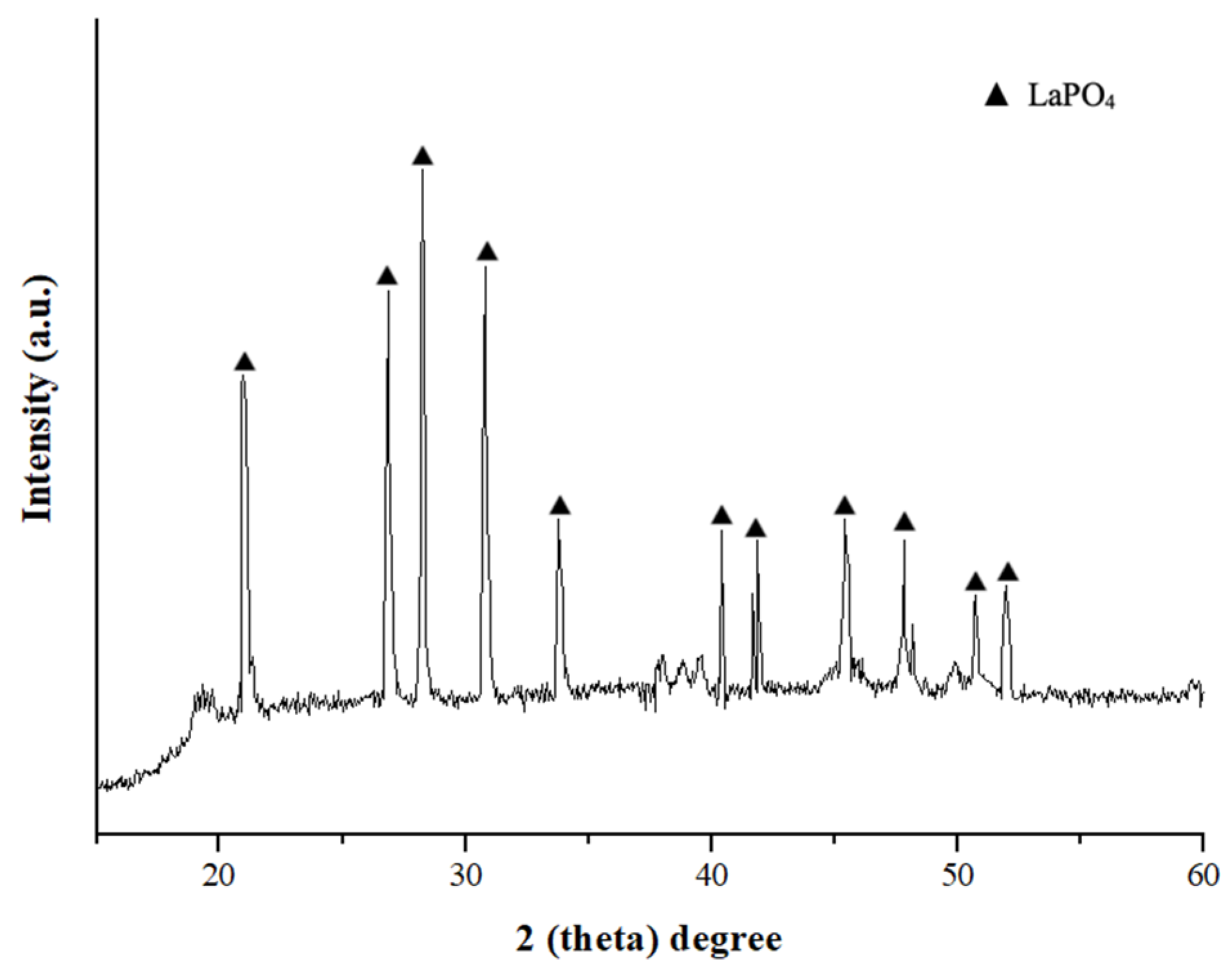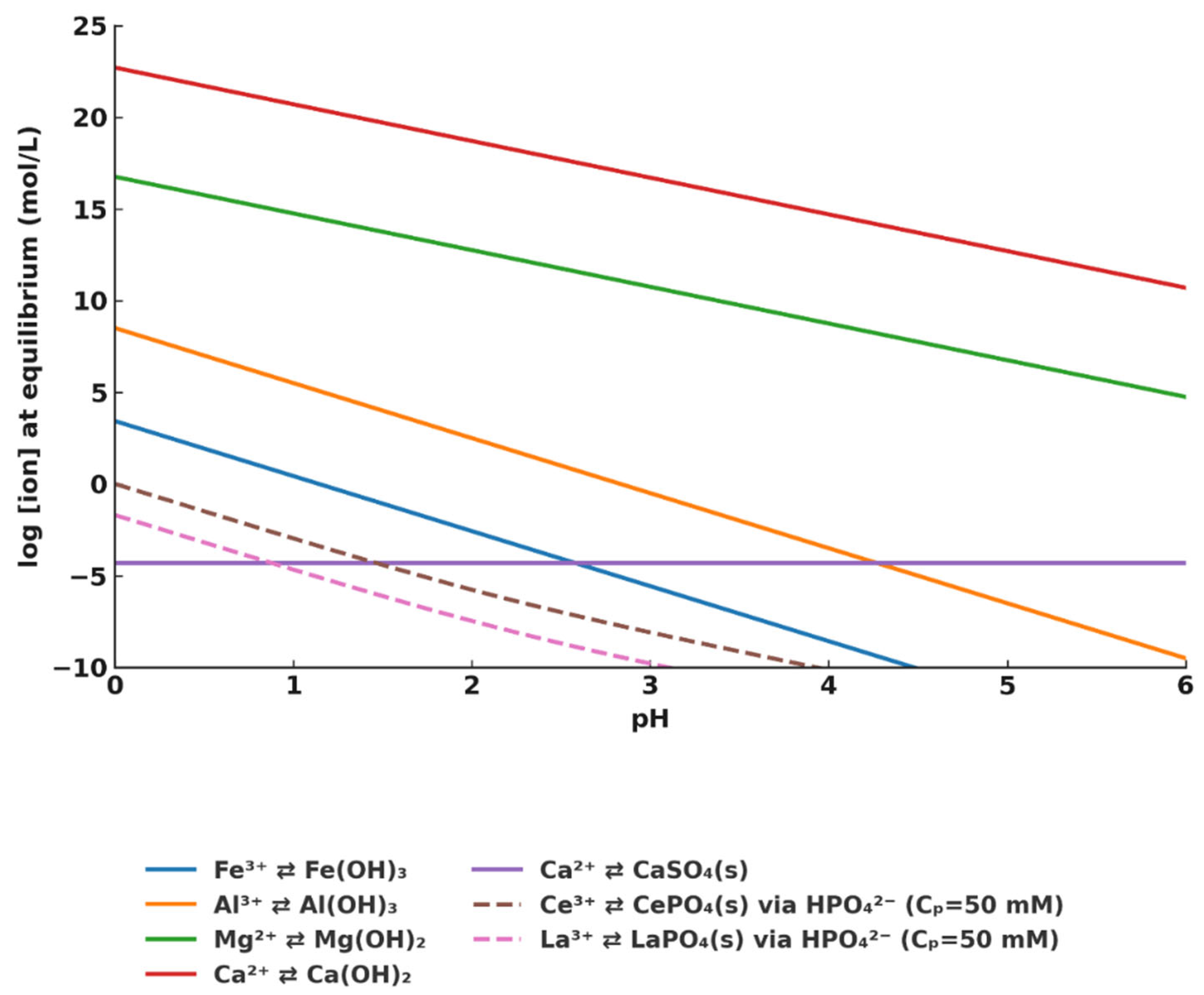 - Lanthanum step. The filtrate obtained after Ce removal was (optionally) re-acidified to pH 2.0–2.2 to standardize the starting conditions. Orthophosphoric acid was then added to achieve a total phosphate concentration of 25–50 mM. The pH was gradually raised to 3.4–3.5 using 1 M NaOH (≤0.5 mL/min) over 30–60 min while stirring at 25 ± 2 °C and 400 rpm. The suspension was held at this pH for 60 min to complete precipitation, with pH stability verified, after which the solid was collected by filtration, washed with distilled water, and dried at 60 °C.
