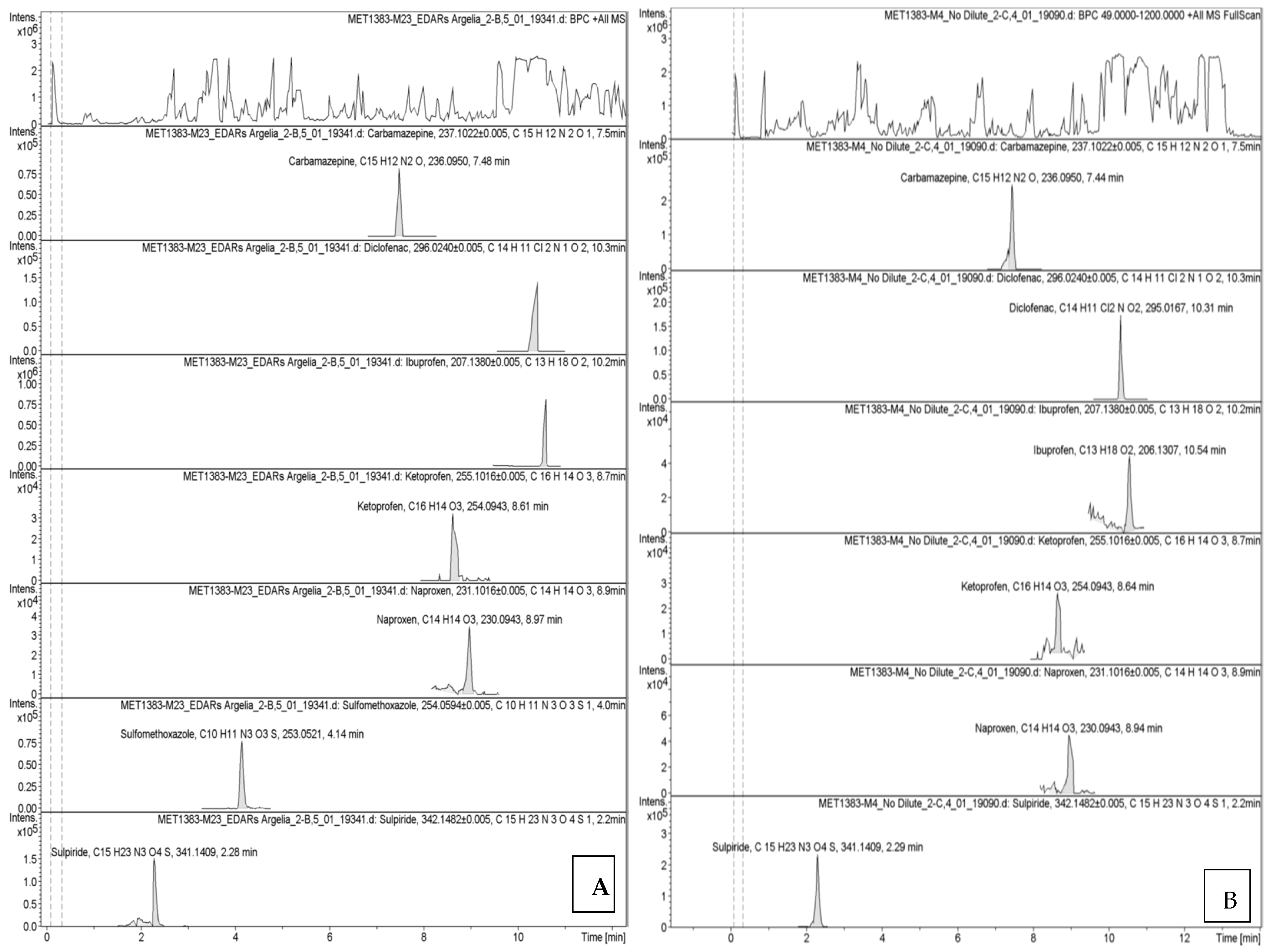- Jelic, A.; Petrovic, M.; Barceló, D. Multi-residue method for trace level determination of pharmaceuticals in solid samples using pressurized liquid extraction followed by liquid chromatography/quadrupole-linear ion trap mass spectrometry. Talanta 2009, 80, 363–371. [Google Scholar] [CrossRef]