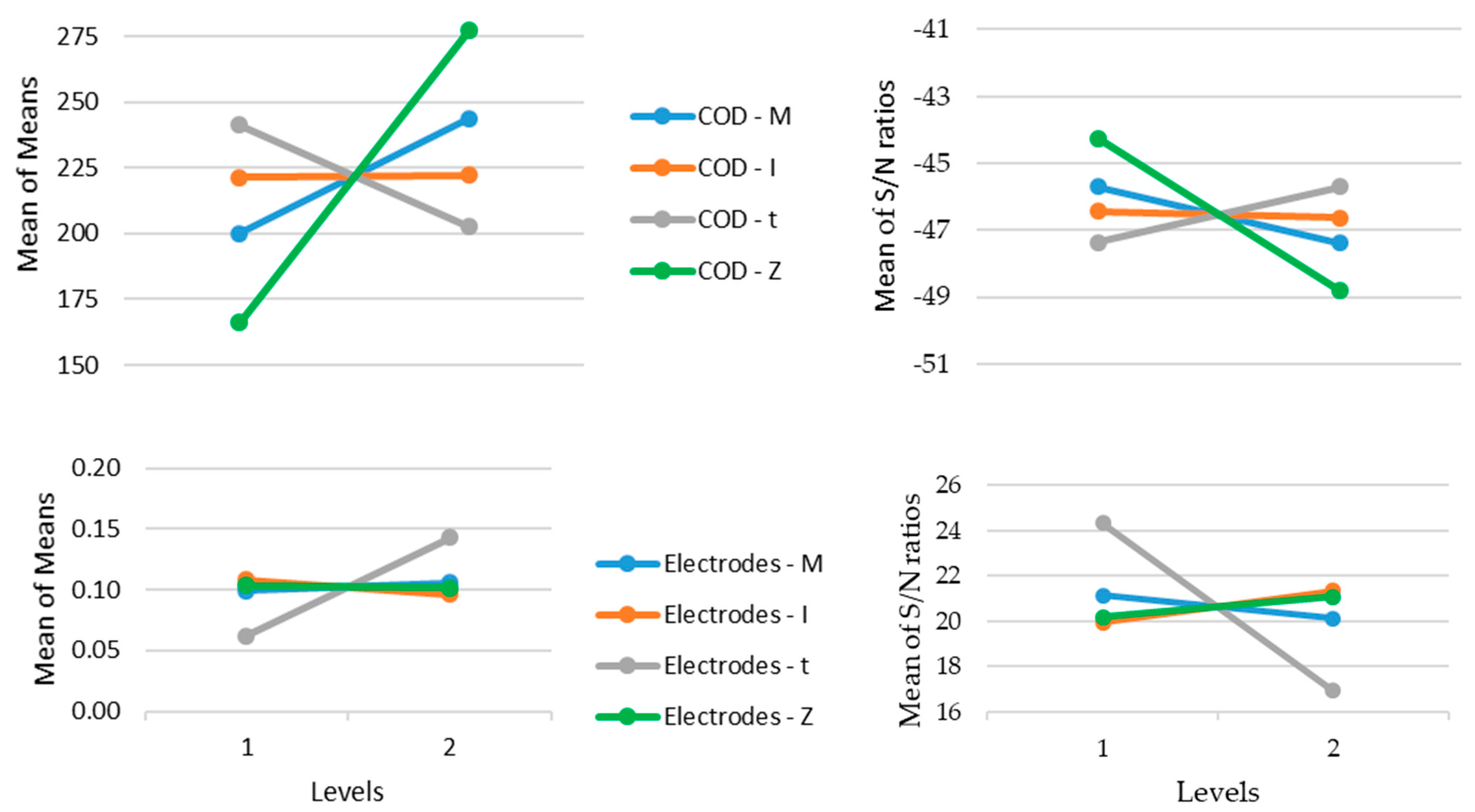 COD—Means | COD—S/N | Electrode Consumption—Means | Electrode Consumption—S/N | |||||