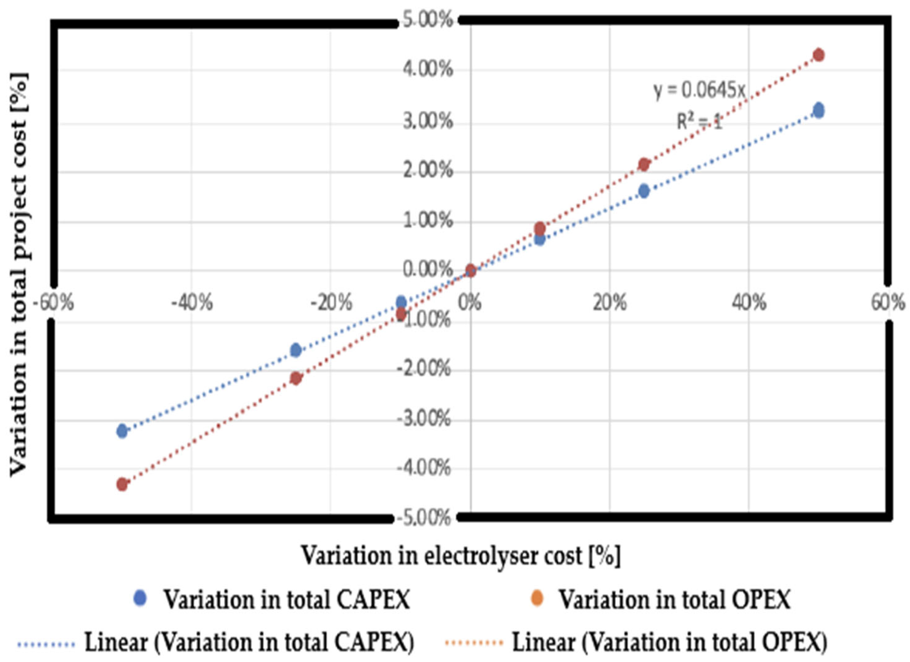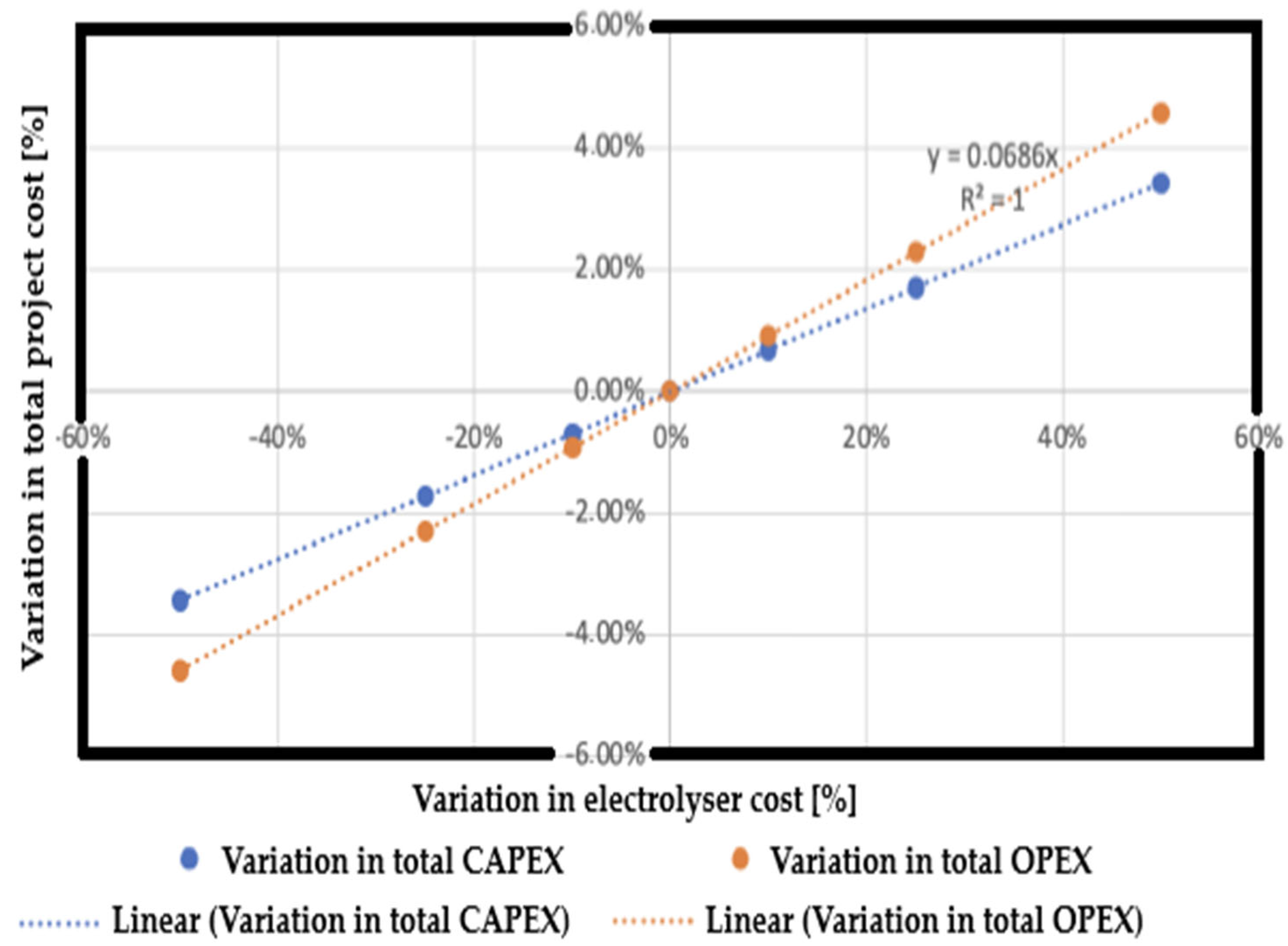 | Main OPEX contributors | Wind turbines (80%), Electrolyzer (8%), Hydrogen tank (7%) | Wind turbines (77%), Electrolyzer (9%), Hydrogen tank (7%) |