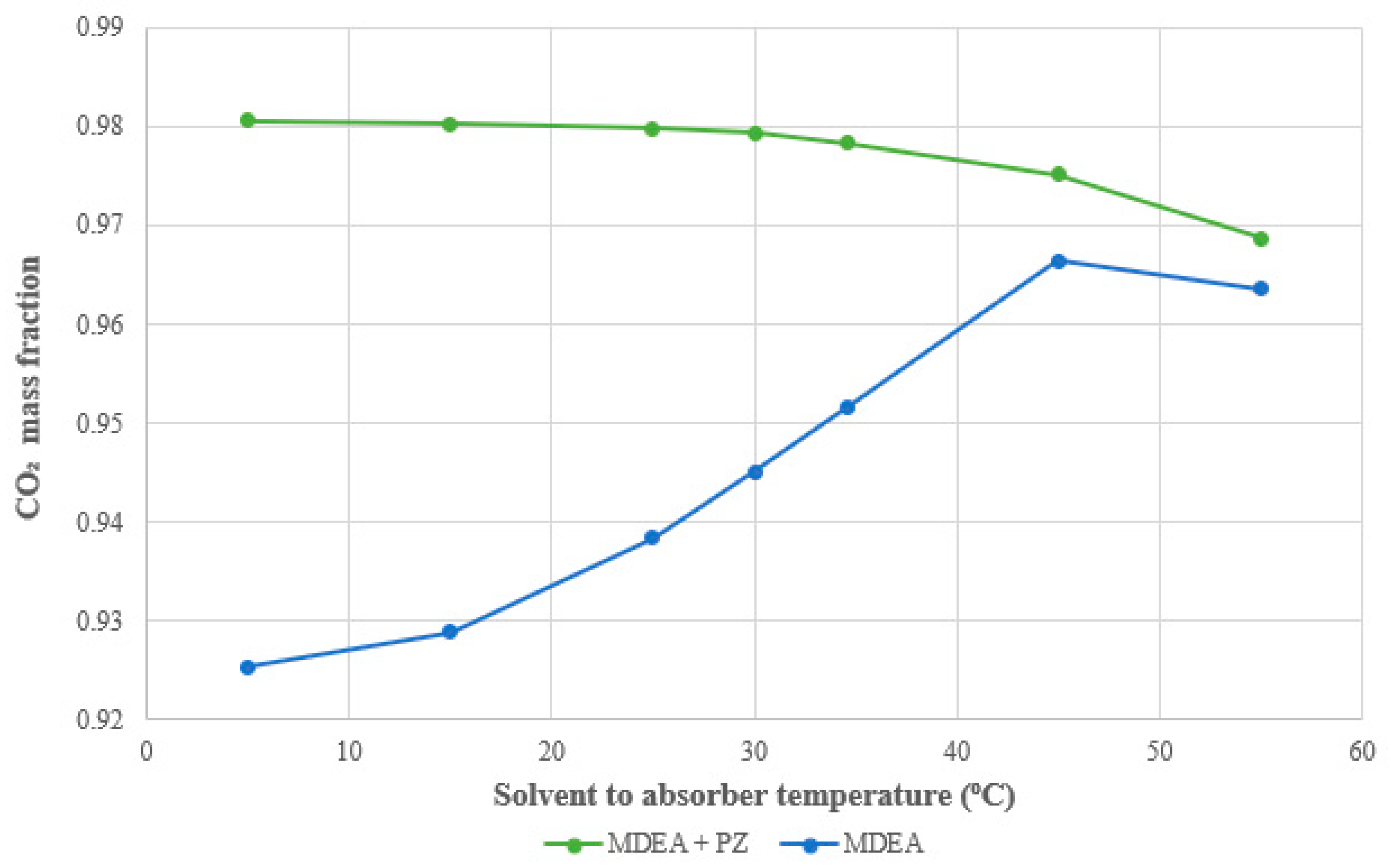 4.1. Effect of MDEA and Piperazine Solvents on CO2 Mass Fraction