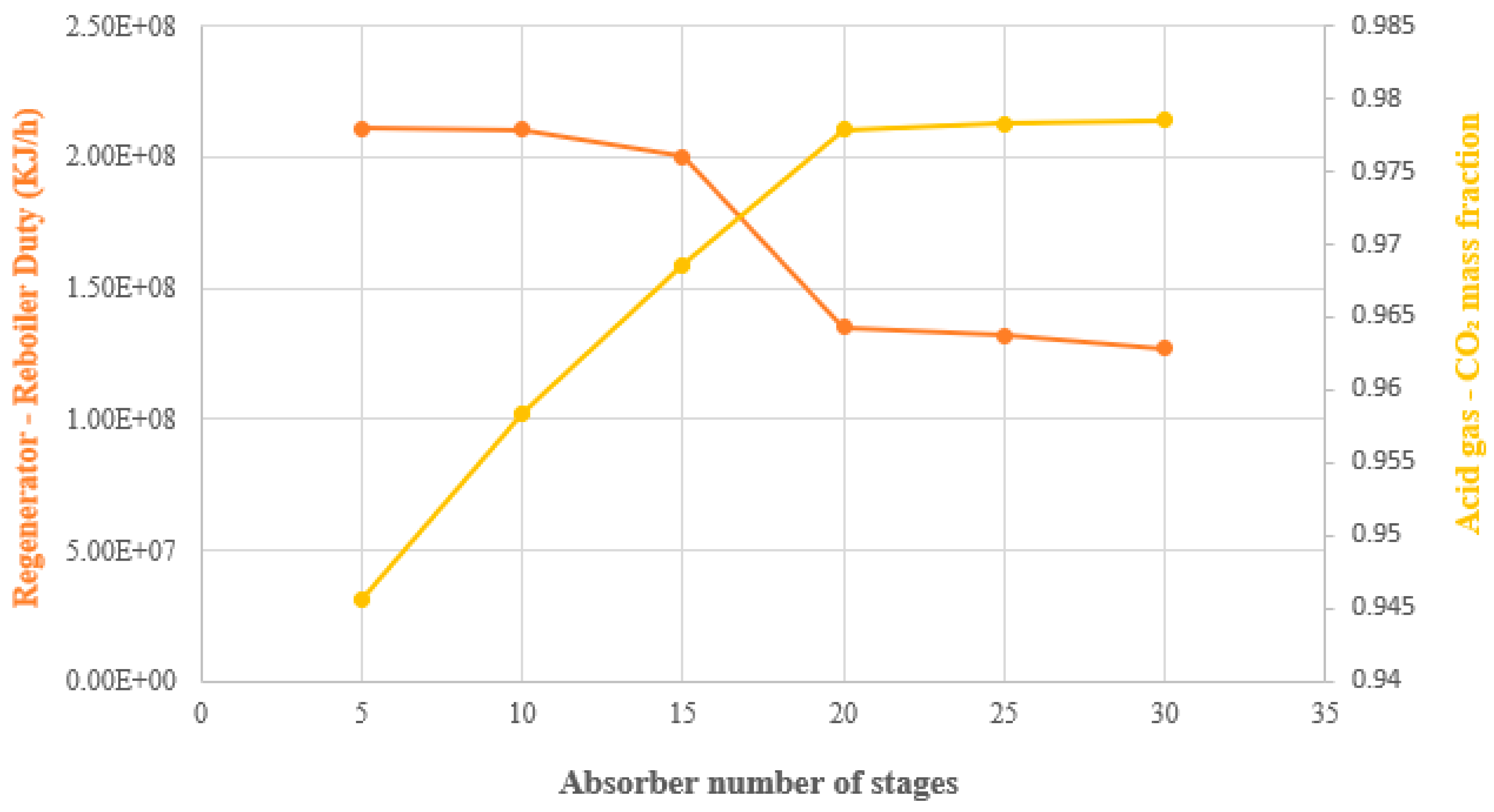 4.2. Effects of Number of Trays on Reboiler Duty and CO2 Mass Fraction