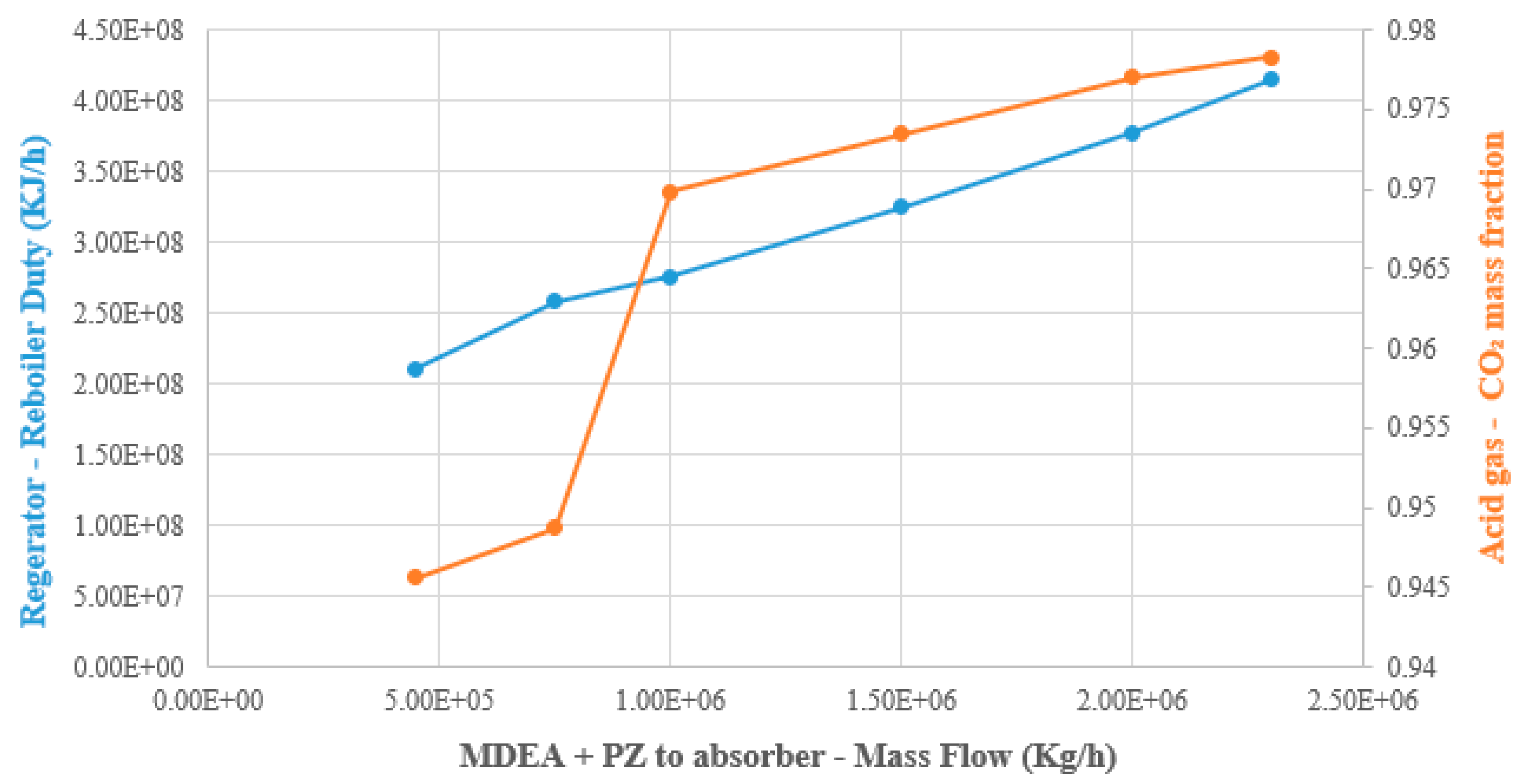 4.3. Effects of (MDEA + PZ) Flow Rate on Acid Gas—CO2 Mass Fraction and Reboiler Duty