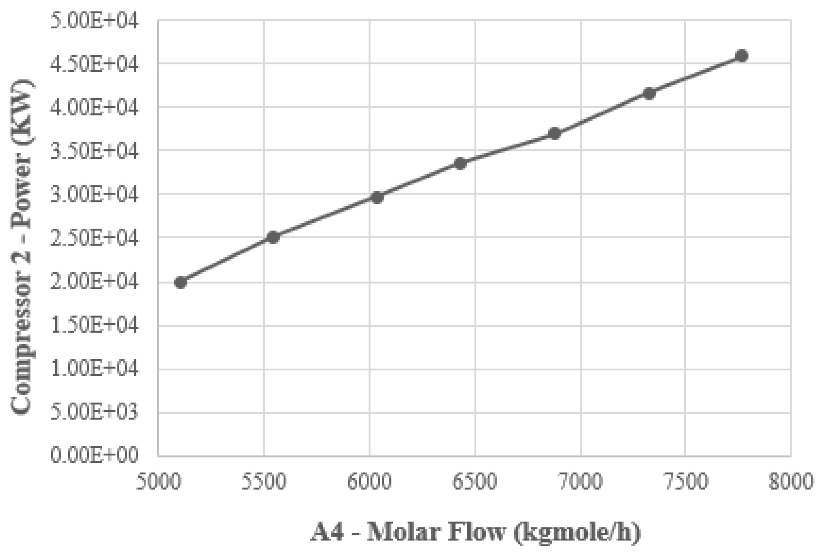 4.5. Effects of Molar Flow of “A4 Stream” on the Power Demand of Compressor “2”