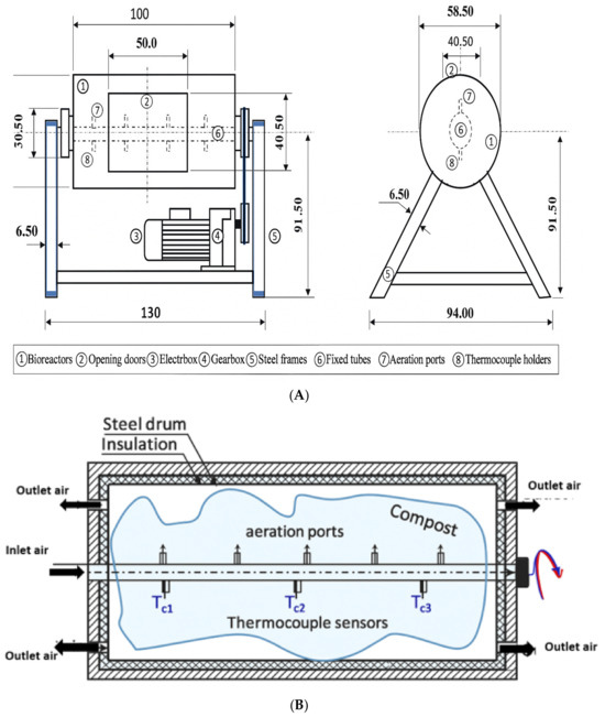 Diagram designed by [21] illustrating the design of the rotary-drum bioreactor system (A) (dimensions in centimeters); (B) cross-sectional view of the drum highlighting the positions of the aeration inlet and outlet ports, as well as the placement of thermocouple sensors.
