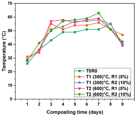 The thermophilic phase is critical for organic matter decomposition during composting, characterized by a distinct and rapid temperature typically peaking around Day 7, followed by a gradual decline. In this study, biochar (BC) amendments significantly influenced the temperature dynamics of the composting process. The control treatment (T0) exhibited the lowest peak temperature at 55.5 °C, while biochar-treated composts achieved notably higher thermophilic peaks. The most pronounced effect was observed in T2R2 (10% BC at 600 °C), which reached 63.5 ± 0.5 °C on Day 7, aligning well with the optimal thermophilic range of 45 °C to 65 °C. Similarly, treatments with BC pyrolyzed at 300 °C (T1) also showed elevated temperatures compared to the control.