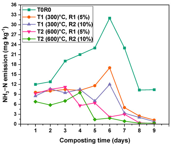 The application of BC, at both 5% and 10% rates, accelerated the composting process, and application rates significantly reduced NH3 emissions during the thermophilic phase. This acceleration is likely due to enhanced microbial activity and improved nitrogen retention mechanisms. BC contributes to the stabilization of NH4+ through both physical adsorption and cation exchange, limiting its transformation into gaseous NH3. Furthermore, BC develops pore microhabitats favorable for the proliferation of nitrifying bacteria (e.g., Nitrosomonas. Nitrobacter) that oxidize NH4+ into NO3−, thereby reducing NH3 volatilization. Chen [30] demonstrated that adding BC at (2%–10%) to chicken manure significantly reduced NH3 emissions compared to the control treatment. Similarly, the authors of Ref. [31] found that 4% of the BC rate significantly increased nitrate (NO3−) concentration in mature compost from 137.7 to 323.7 mg kg−1 and reduced nitrogen loss by 3.2 kg per ton of treated waste. Agyarko-Mintah [32] observed that 10% BC decreased total nitrogen losses by 51% and NH3 losses by 60% in poultry litter compost. Moreover, Chen [30] has also demonstrated that BC pyrolyzed at 550–600 °C and applied at 10% reduced NH3 losses by 24.2–56.9%. These findings suggest that BC alters N transformation pathways by improving conditions for microbial nitrification and minimizing NH3 volatilization. The surface area and pH-buffering capacity of BC also enhance microbial resilience and activity during peak thermophilic conditions.