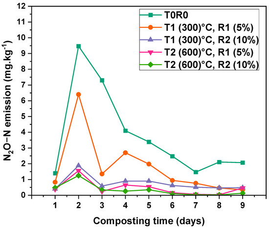 N2O-N emission rate dynamics during the composting process from Day 1 to Day 9 of the thermophilic phase. Fluxes are mean values ± standard error (SE) of three replicates (n = 3). T0—date palm compost without biochar, T1R1—date palm compost amended with biochar pyrolyzed at 300 °C and added at 5% rate during composting, T1R2—date palm compost amended with biochar pyrolyzed at 300 °C and added at 10% rate during composting, T2R1—date palm compost amended with biochar pyrolyzed at 600 °C and added at 5% rate during composting, T2R2—date palm compost amended with biochar pyrolyzed at 600 °C and added at 10% rate during composting. At the 0.05 level, the interaction between time (days) and BC rate is significant (p < 0.001).