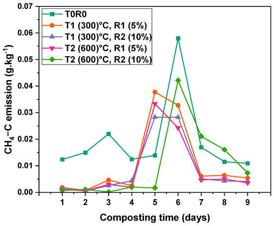 CH4-C emission rate dynamics during the composting process from Day 1 to Day 9 of the thermophilic phase. Fluxes are mean values ± standard error (SE) of three replicates (n = 3). T0—date palm compost without biochar, T1R1—date palm compost amended with biochar pyrolyzed at 300 °C and added at a 5% rate during composting, T1R2—date palm compost amended with biochar pyrolyzed at 300 °C and added at a 10% rate during composting, T2R1—date palm compost amended with biochar pyrolyzed at 600 °C and added at a 5% rate during composting, T2R2—date palm compost amended with biochar pyrolyzed at 600 °C and added at a 10% rate during composting. At 0.05 level, the interaction between time (days) and BC rate is significant (p < 0.001).