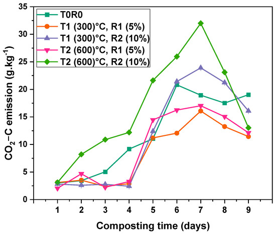 CO2-C emission rate dynamics during the composting process from Day 1 to Day 9 of the thermophilic phase. Fluxes are mean values ± standard error (SE) of three replicates (n = 3). T0—date palm compost without biochar, T1R1—date palm compost amended with biochar pyrolyzed at 300 °C and added at a 5% rate during composting, T1R2—date palm compost amended with biochar pyrolyzed at 300 °C and added at a 10% rate during composting, T2R1—date palm compost amended with biochar pyrolyzed at 600 °C and added at a 5% rate during composting, T2R2—date palm compost amended with biochar pyrolyzed at 600 °C and added at a 10% rate during composting. At the 0.05 level, the interaction between time (days) and BC rate is significant (p < 0.001).