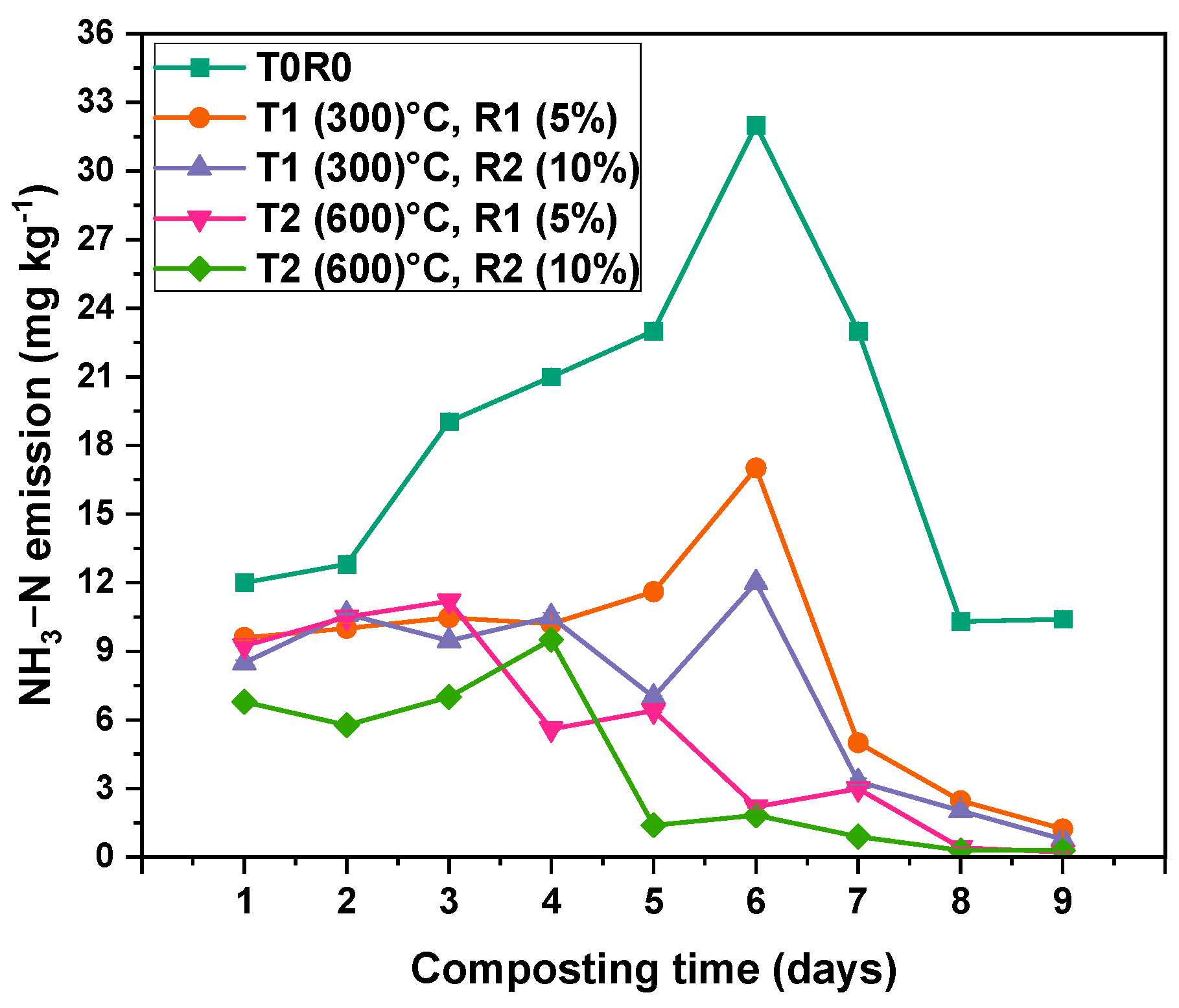 - Agyarko-Mintah, E.; Cowie, A.; Van Zwieten, L.; Singh, B.P.; Smillie, R.; Harden, S.; Fornasier, F. Biochar lowers ammonia emission and improves nitrogen retention in poultry litter composting. Waste Manag. 2017, 61, 129–137. [Google Scholar] [CrossRef]