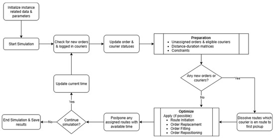 A simulation environment was created to capture uncertainties such as the arrival of orders, delivery sequences, and the possibility of changes in routes. Therefore, orders and couriers are entered into the system according to the records in the data, and it is assumed that there is no information about upcoming orders beforehand. As seen in Figure 1, the simulation starts by preparing this data set. Then, the time counter starts and the system checks whether there is a new order or courier entering the system. In the advanced stages of the simulation, information such as assigned and unassigned orders transferred from previous iterations and couriers whose shifts are ongoing are also included in the current orders and couriers along with new orders and couriers. After the status and locations of the current orders and couriers are updated, information such as distance and duration matrices and updated time windows that will be required for routing are created. The compiled information is transferred to the routing algorithm, the obtained routes and the courier information to which those routes are assigned to are recorded, the transition to the next time point is made, and the process is repeated from the beginning. The simulation stops when all the orders are delivered and all the couriers have logged out.