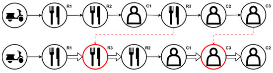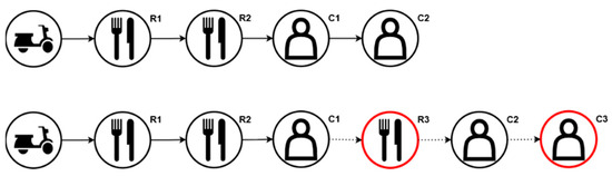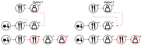 In the case of a high number of unassigned orders and insufficient number of couriers, Algorithm 3 takes place to minimize the number of unassigned orders. The assignment is carried out by placing unassigned orders on the optimum route and in the optimum position which causes minimum total delay, i.e., the total deviation in duration to execute steps assigned already plus the total duration to execute new steps. In Figure 4, order 3 is examined for fitting among orders 1 and 2. The optimum place to fit order 3 in the R1-R2-C1-C2 sequence is found by placing restaurant pick-up task 3 (R3) of order 3 right after customer drop-off task 1 (C1) of order 1 and customer drop-off task 3 (C3) of order 3 after customer drop-off task 2 (C2) of order 2, thus creating the new sequence of R1-R2-C1-R3-C2-C3. The order fitting algorithm is triggered by the following cases when there are the following: