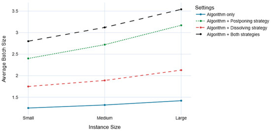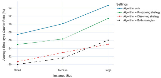After individually testing the performance of strategies, we combined them with the multi-step algorithm, expecting to see their strengths affect the end results and provide better performance than both of them in pairwise comparisons. In Figure 6, we can observe that this setting yields more batches than the rest of the settings, 123.9% to 149.3% more than the solo algorithm, 37.5% to 39.7% more than the dissolving strategy, and 10.4% to 14.2% more than the postponing strategy. We can see similar results in courier employment rates, with the combined strategies setting providing superior results overall, excluding the large instances where the dissolving strategy yields slightly better results (only 1.2% less) while not supplying the demand at the level of current strategy (see Figure 7). For the rest of the metrics, as shown in Table 6, we can easily say that the combined strength of both strategies supports the weak points of each other and, in the end, creates a robust system that provides satisfactory results for all the stakeholders in reasonable time.