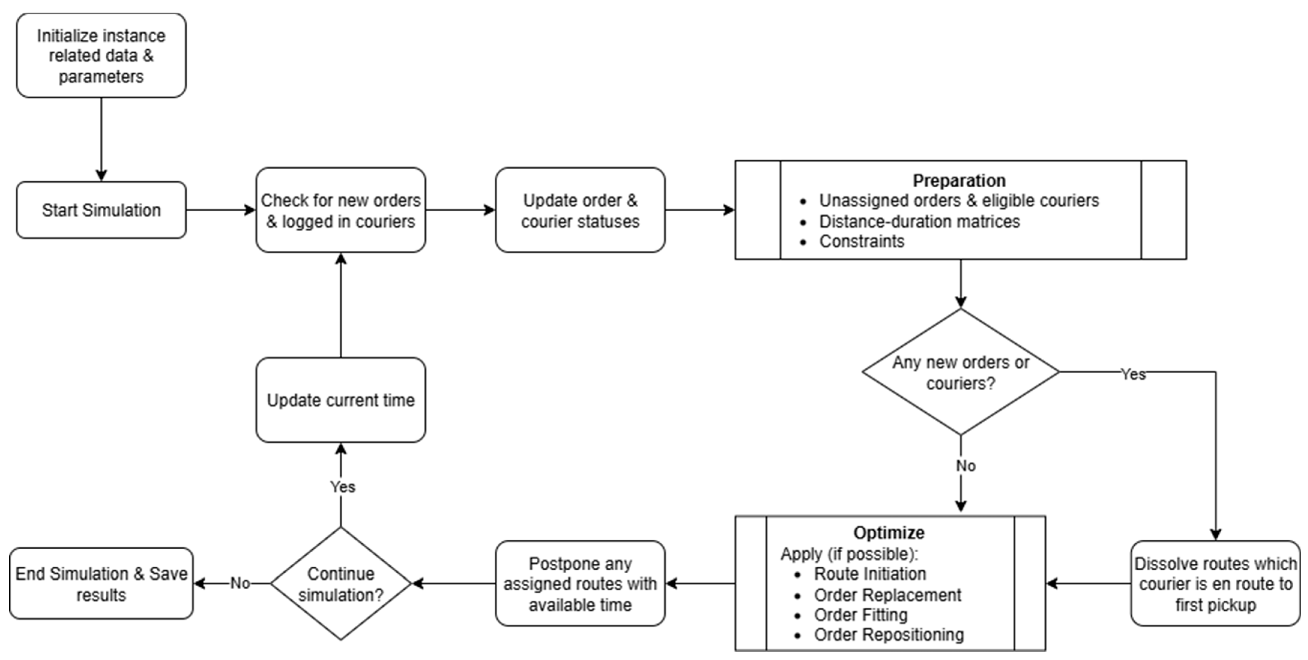 Figure 1, the simulation starts by preparing this data set. Then, the time counter starts and the system checks whether there is a new order or courier entering the system. In the advanced stages of the simulation, information such as assigned and unassigned orders transferred from previous iterations and couriers whose shifts are ongoing are also included in the current orders and couriers along with new orders and couriers. After the status and locations of the current orders and couriers are updated, information such as distance and duration matrices and updated time windows that will be required for routing are created. The compiled information is transferred to the routing algorithm, the obtained routes and the courier information to which those routes are assigned to are recorded, the transition to the next time point is made, and the process is repeated from the beginning. The simulation stops when all the orders are delivered and all the couriers have logged out.