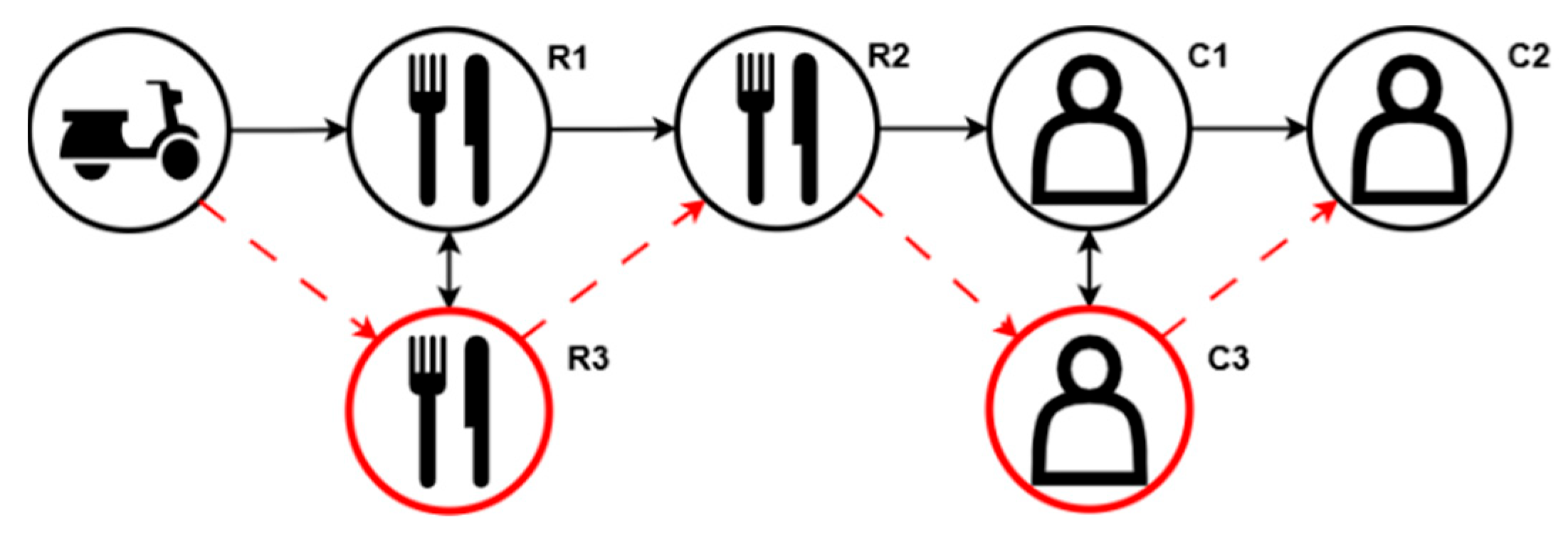 17] propose an optimization algorithm based on Graph Neural Network (GNN) for OFD order dispatching, combining machine learning and operational research methods to dispatch orders to couriers in real time in order to improve delivery efficiency and customer satisfaction. The solution consists of two attention mechanisms to learn the matching relationship between orders and couriers and greedy and regret value-based dispatching heuristics to ensure solution quality. A multi-objective model and an action consolidation–non-dominated sorting genetic algorithm is proposed by Shao et al. [
