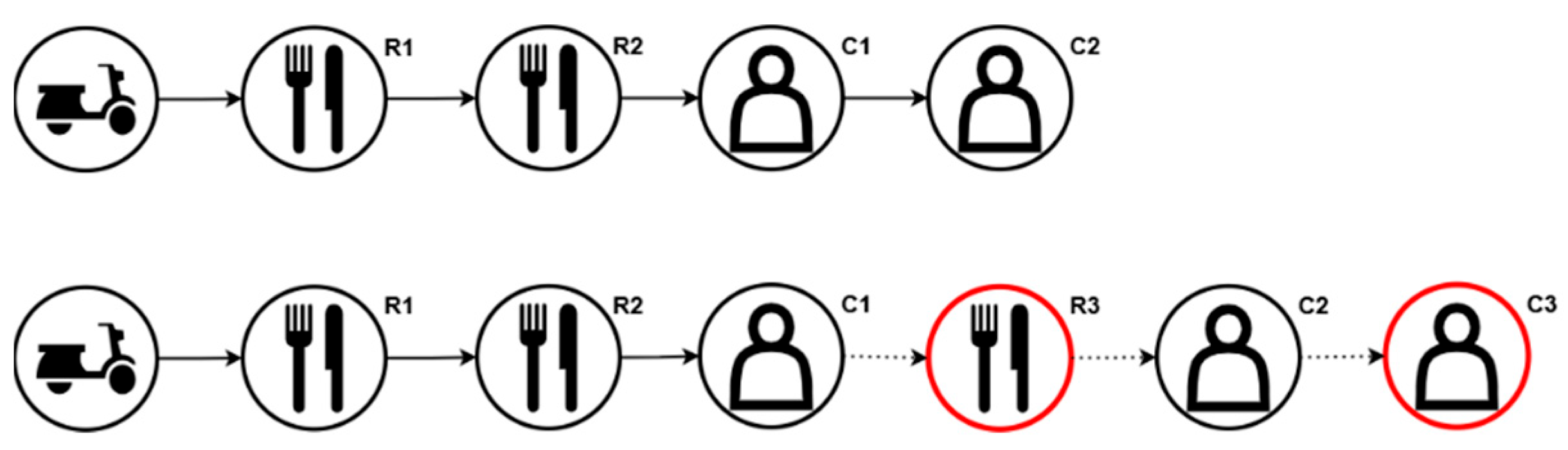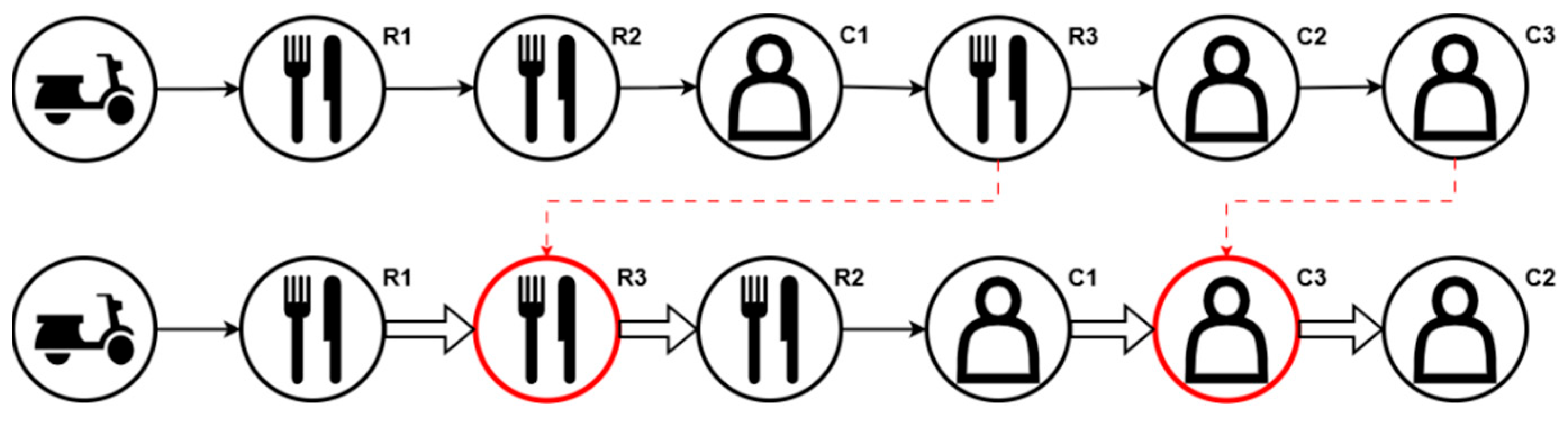Figure 3, order 1 (restaurant pick-up task 1 (R1) and customer drop-off task 1 (C1)) is selected to be replaced with candidate order 3 (restaurant pick-up task 3 (R3) and customer drop-off task 3 (C3)), in the exact task positions and under feasibility conditions. The previous route formation, R1-R2-C1-C2 temporarily becomes R3-R2-C3-C2 and the procedure continues as explained in Algorithm 2.