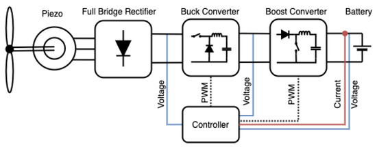 Figure 3 shows the general circuitry of the proposed ESU and controller attached to the terminals of PWEH. Initially, the generated voltages are transmitted to the rectifier circuit; afterwards, the rectifier output is forwarded to a dc-dc converter that has buck/boost characteristics. A battery is added at the end of the overall system, as seen in Figure 3. Also, at this point, a state of charge (SOC) is controlled, too. In the literature, there are some techniques for the estimation of the maximum power point (MPP). According to Table 1, the battery with Li-ion has 0.1 Ah under the maximum value of 3.6 V, although it has some environmental problems and recyclability issues. However, in our system, other battery types can also be used when the battery impedance is considered relevant to the output of circuitry. In addition, although the overall system consists of many components, they are very cheap due to the low-power operation of the system.