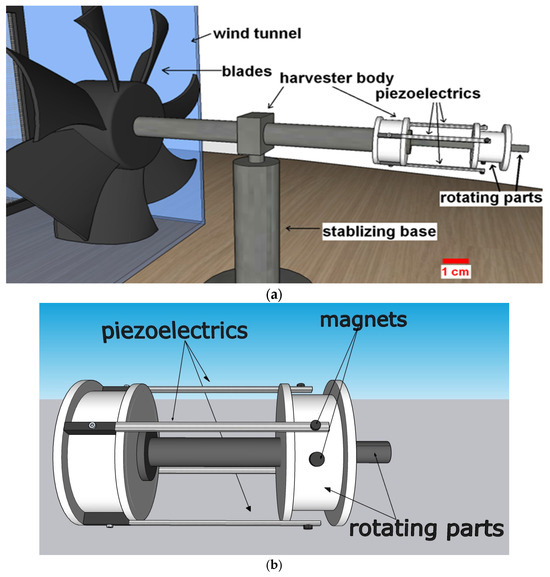 (a) PWEH unit with piezoelectric materials at the tip of the rotating parts; (b) a close look at the piezoelectric and magnet components.