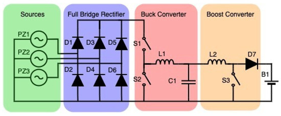 Among various harvesting materials, piezoelectricity exhibits pressure electricity through the variation in potential structure inside crystalline material. These materials include Rochelle salt, quartz, tourmaline, barium titanate, etc. When pressure is applied to them in a certain direction, these crystals undergo a deformation; in addition, when an electric field E is applied to the terminals of these materials, as a converse effect, a vibration occurs in the material itself. When a converse effect is applied, it can be used as an actuator, and thereby, the direct effect can be used as a sensor or energy transducer in that context [32]. According to the detailed works, energy densities of piezoelectric energy harvesters are three or five times higher than those of electrostatic or electromagnetic harvesters [9,33]. With their compact nature, piezoelectric harvesters are widely used for wireless applications in the industry and daily life [34,35,36,37]. The main reasons for the wide usage cases are easy installation and maintenance [38]. Following the advances in material engineering, the production of piezoelectric materials has become cheaper compared to the past decades. This reality in the market also enables the piezoelectric harvesters to find a good place in addition to thermoelectric generators and solar photovoltaics [39]. Although piezoelectric components generate less energy, the output can be conveyed to an electronic device directly or a storage unit [40]. Harvested energy can be usable with converters; however, their efficiency should be enough to proceed and to avoid energy losses. Therefore, by using the outputs of three piezoelectric layers, a full bridge rectifier depicted in Figure 1 has been designed and used in an energy storage unit (ESU).