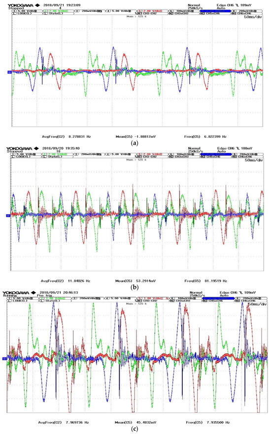Real oscilloscope waveforms (i.e., colors correspond to three phases) of piezoelectric layers: (a) wind speeds at 2.7 m/s; (b) 3.5 m/s; and (c) 6.1 m/s.