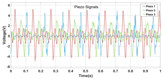 The main circuitry consists of 4 block diagrams (Figure 4): The initial one is the PWEH device itself. Sample harvested waveforms are shown as an input to the rectifier in Figure 5. Piezoelectric materials are 120 degrees from each other for the electrical phase variation; therefore, they produce different waveforms depending on their natural frequencies. The second block is the rectifier. It is full-bridge rectifiers that convert AC waveforms to a DC waveform. The third diagram is the buck converter, where the full-rectified waveform (Vrect) is controlled by the buck converter for the MPPT aim. According to the literature, there exist a few techniques to estimate and track the MPP. Hill-climbing (HC) and fractional open-circuit voltage (FOCV) methods are frequently used techniques [47,48]. The last block is a boost converter, where current and voltage are controlled for the battery’s SOC. The rectifier works as an open-circuit (Voc). The fractional open-circuit voltage (FOCV) method is based on determining the VOC at which maximum power is delivered. Then, the MPPT obtains the Voc value. This is also stored in a capacitor, and then it is utilized as the reference voltage for Vrect. Note that the MPPT governs the DC-DC converter for the regulation of the output waveform in the vicinity of Voc by monitoring the change in Vrect. In the last part, a lithium-ion battery operates as a rechargeable battery type, where lithium ions move from the negative potential to the positive one during the discharge process [49]. These batteries are popular for portable electronics as they have the best energy-to-weight ratios, low self-discharge rate, and high open-circuit voltage [50].