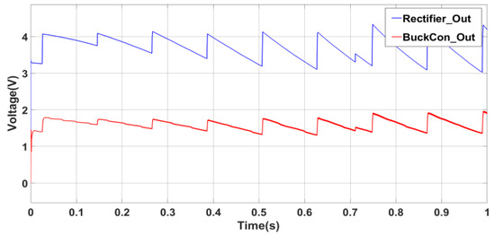 In Figure 7, the rectified waveforms after the rectifier and buck converter are shown. Note that, although the voltage values are around 3.5 V and 1.5, the current values are low; therefore, the power harvested from such systems is in the order of μW scale.