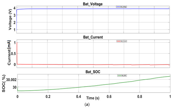 The battery voltage, current, and SOC values are shown in multiple plots of Figure 8a–c. It is clear that while the current decrease over time due to the storage, the controller SOC value increases slowly. In a very short time interval, the output voltage is stabilized for storage, which is also important for the stability of the circuit. By comparing the plots in Figure 8a–c, it has been understood that the battery current strictly depends on the rotation speed; indeed, higher rotations reasonably yield higher battery currents.