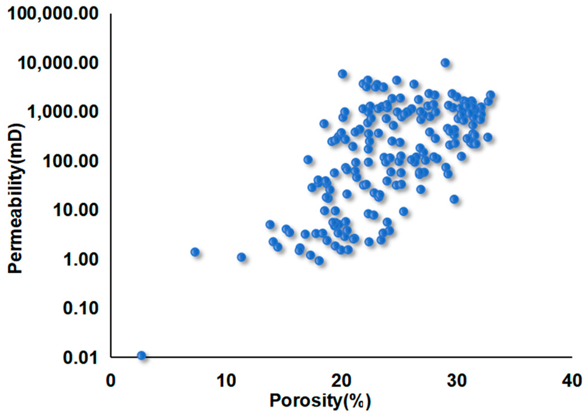 Figure 2, the average porosity of the reservoirs in the study area is 20.21%, with porosity of some intervals reaching up to 32.9%. The permeability spans an extensive range, distributed from several millidarcies to thousands of millidarcies, with an average permeability of 708.01 mD, indicating the easy formation of extremely high-permeability channels. Significant differences are observed in physical properties, with the reservoirs generally exhibiting high porosity and high permeability characteristics. Such differences in physical properties lead to apparent lateral and vertical reservoir heterogeneity and significant variations in connectivity, which pose enormous challenges to water-flooded layer identification under these complex geological conditions.