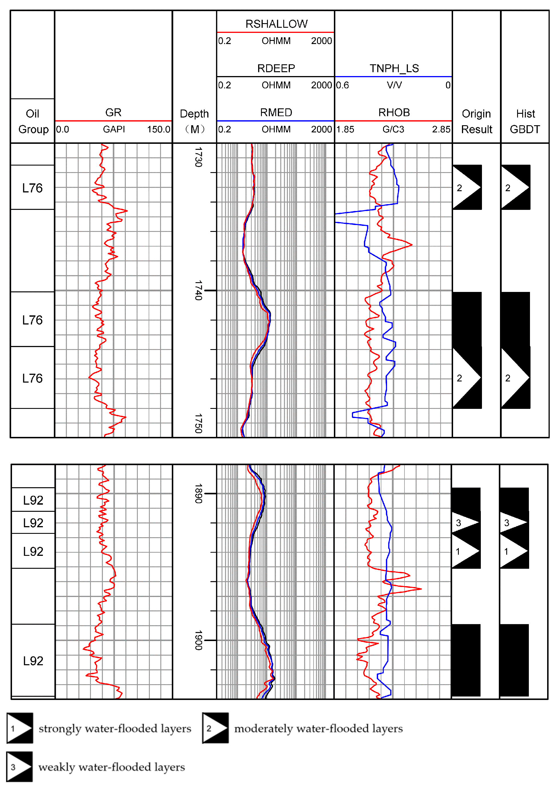 Figure 3 that all black intervals represent oil layers. In contrast, black intervals with numbers represent water-flooded layers, where number 1 denotes strongly water-flooded layers, number 2 denotes moderately water-flooded layers, and number 3 denotes weakly water-flooded layers. As shown in