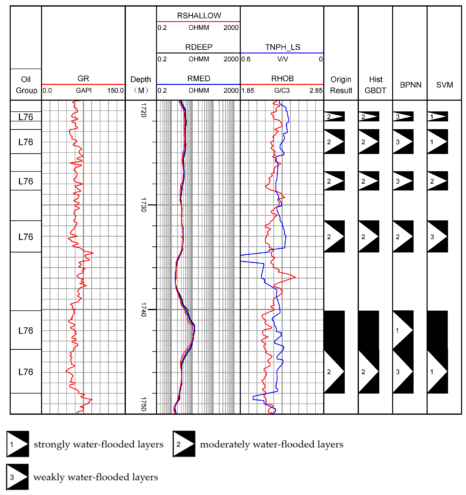 Figure 12, the last three columns show the water-flooded layer identification result diagrams of the HistGBDT, BPNN, and SVM models, respectively. The identification results of HistGBDT are consistent with the original interpretation conclusions. In well sections with complex logging responses—especially those with drastic changes in resistivity curves and complex synergistic responses of porosity and density—it can more accurately match the actual water-flooding conditions, demonstrating its strong fitting ability for nonlinear correlations in logging data and excellent generalization performance. The identification results of BPNN and SVM have more obvious deviations from the original results, reflecting that traditional machine learning methods are affected by their own limitations in the water-flooded layer identification task: BPNN is prone to overfitting, while SVM has weak adaptability to multi-classification and complex data.