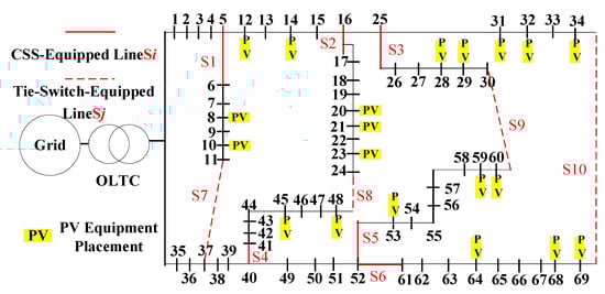 where Rk is cost per OLTC tap change; k, kpre current and previous tap positions of the OLTC; χ is set of all network nodes. Rs is cost per switching action of the tie switch; sij,  is on/off states of line (i,j) at the current and previous time steps (1 for closed, 0 for open);
