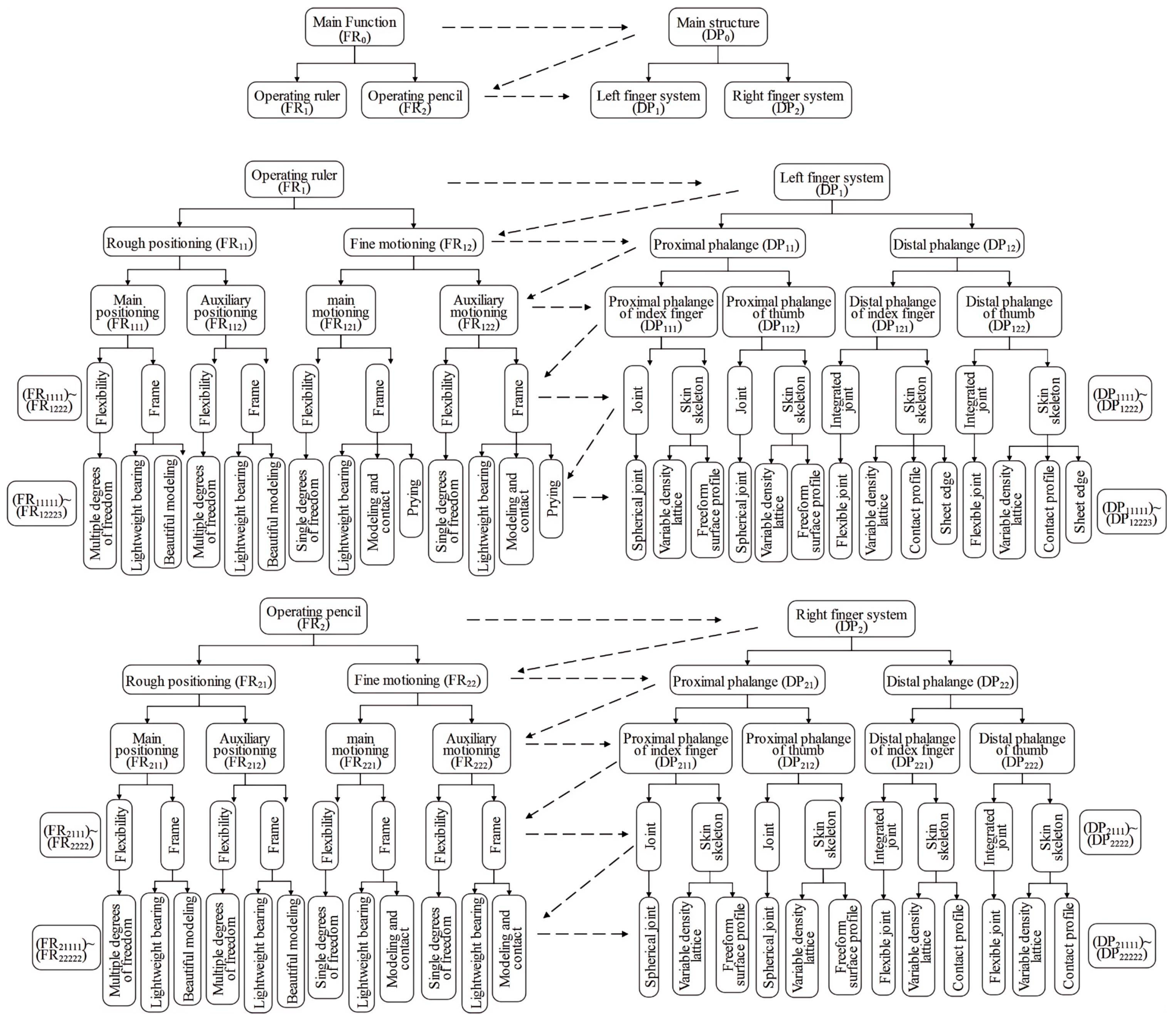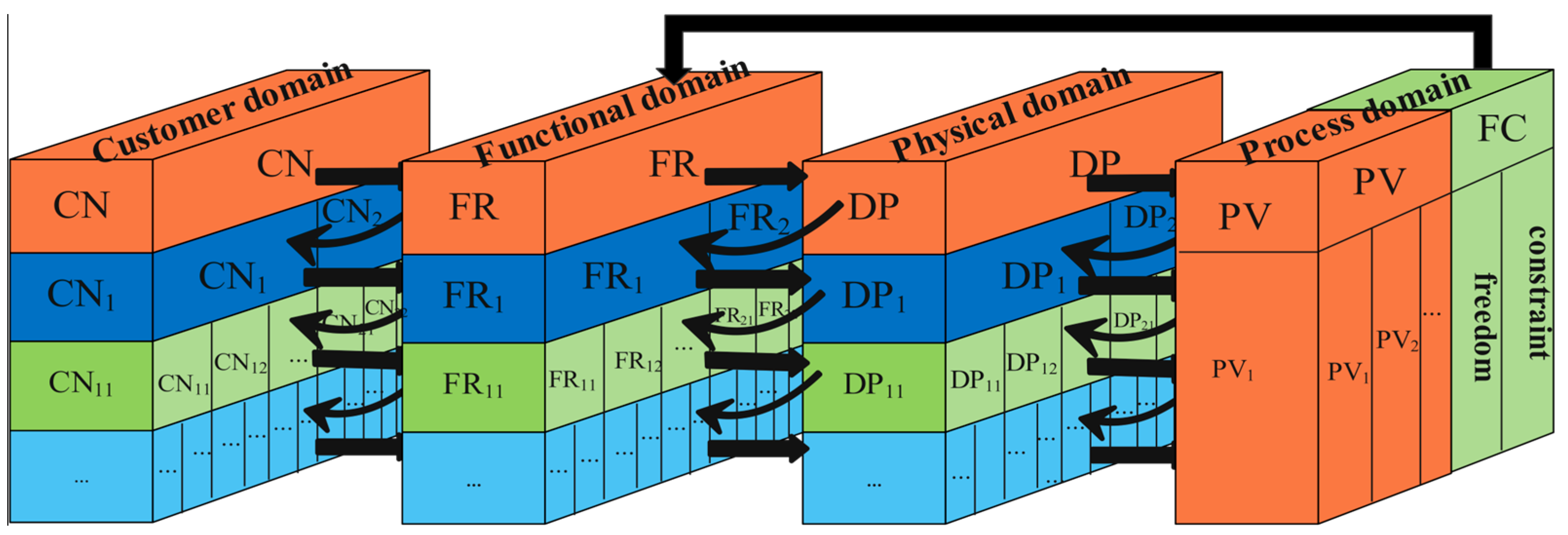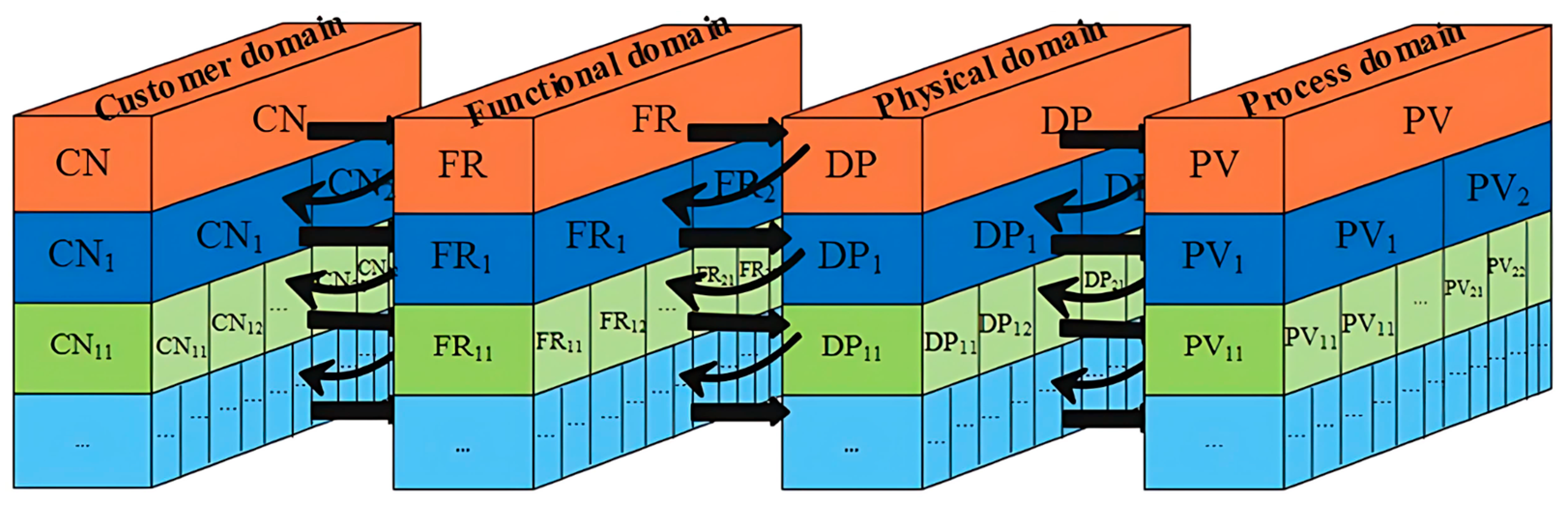 In this context, axiomatic design theory emerges as a powerful candidate to address this gap, as it is a systematic design methodology with its core lying in the “zigzag” mapping process between the customer, functional, physical, and process domains. This approach, guided by the Independence Axiom and Information Axiom, breaks cognitive fixedness to achieve globally optimal solutions [