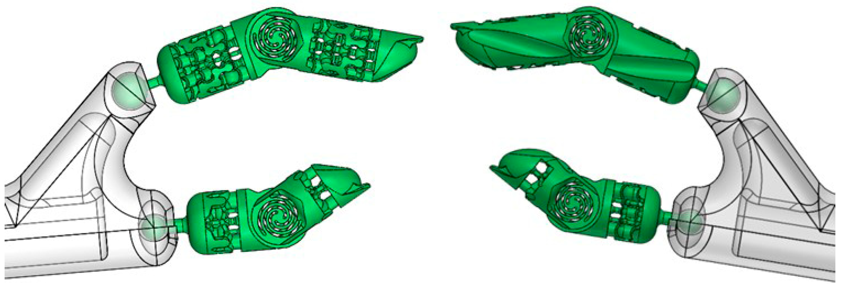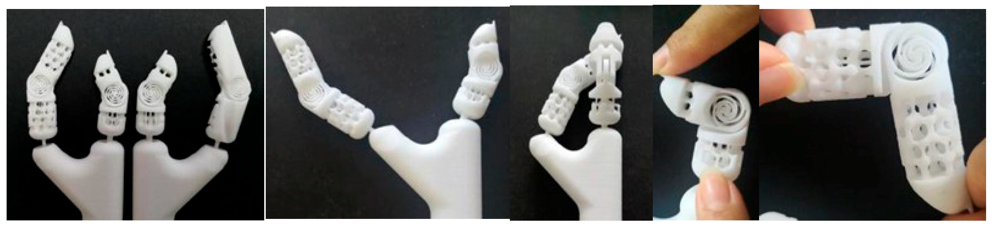 Figure 10, where the interphalangeal joints were designed in detail as customized flexible joints with integrated function. In addition, the variable density lattice filling is applied to the design practice of mechanical finger filling frames to obtain a lighter finger structure with better force transmission paths.