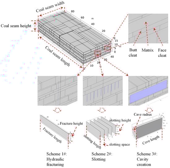 The coal seam stimulation model established in this study comprises two components: the coal seam and the stimulated region. The coal seam consists of the matrix, face cleats, and butt cleats, where the face cleats are randomly distributed along the thickness direction of the coal seam, and the butt cleats are randomly distributed between two adjacent face cleats, orthogonal to the face cleats. The flow chart of coal seam construction is presented in Figure 1. The stimulated region is located at the center of the coal seam’s end face and is categorized into three schemes: hydraulic fracturing (represented by a single elongated cuboid), slotting (represented by multiple small rectangular prisms), and cavity creation (represented by a cylinder bisected axially), presented in Figure 2. The specific geometric parameters of the coal seam region and the stimulated region are detailed in Table 1 and Table 2. In real coal seams, cleats and fractures are rough, and cavities are not perfect cylinders. In this research, these are simplified by assuming that cleats and fractures are regular and smooth planes, and cavities are cylindrical. This approach is due in part to the inability to obtain real and accurate shapes of cleats, fractures, and cavities in the field and also because it significantly reduces the computational load of numerical simulations while ensuring reliable accuracy.