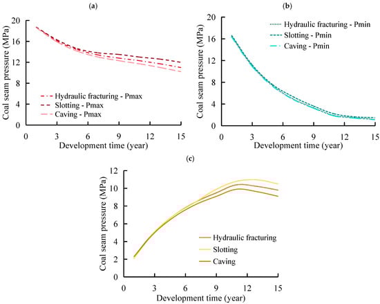 Taking the development of CBM via slotting as an example, the simulation results show pressure variations in coal seams with developed cleats, as illustrated in Figure 4. The results indicate that as the development pressure in the slotting decreases, the pressure within the cleats initially drops, segmenting the coal seam into high–pressure zones of varying sizes, with the low–pressure zones advancing from the cleats into the coal matrix. The minimum pressure values within the coal seam (represented by downward triangles in the legends of subplots in Figure 4) are located in the cleats near the slotting, while the maximum pressure values (represented by upward triangles in the legends of subplots in Figure 4) are found within the coal matrix. Specifically, the minimum pressure decreases from 16.4 MPa in the first year of development to 1.2 MPa in the fifteenth year, driving the maximum pressure in the matrix from 18.7 MPa to 11 MPa over the same period. However, in the early stages of development, the pressure in the cleats drops more rapidly, causing a pressure differential increase to 10.4 MPa by the eleventh year. Subsequently, the pressure in the cleats stabilizes while the matrix pressure decreases steadily, reducing the pressure differential to 9.8 MPa by the fifteenth year. The post–hydraulic fracturing and cavity creation pressure distributions within the coal seam are similar to those by slotting, with the variations in their maximum pressure Pmax, minimum pressure Pmin, and pressure difference depicted in Figure 5.