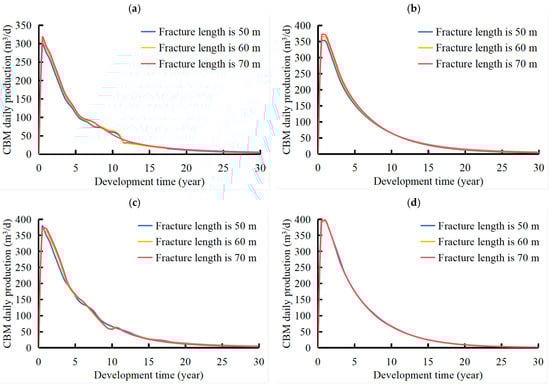 Effects of fracture length on productivity in different coal seams: (a) Coal seam 1#; (b) Coal seam 2#; (c) Coal seam 3#; (d) Coal seam 4#.