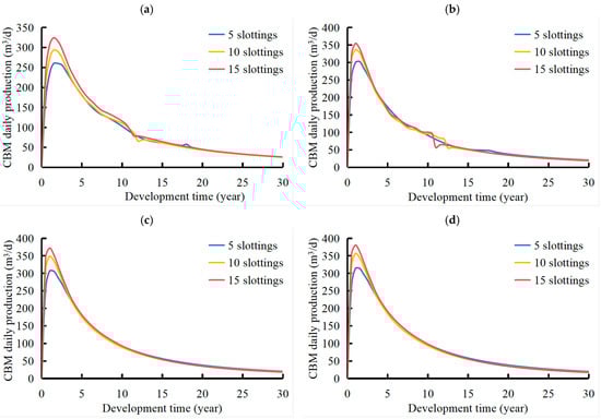 Effects of slot number on productivity in different seams: (a) Coal seam 1#; (b) Coal seam 2#; (c) Coal seam 3#; (d) Coal seam 4#.