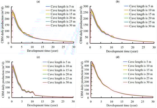 When developing cleat–developed CBM through cavity creation, the simulation results illustrating the impact of cave length on CBM production are depicted in Figure 8. Similarly to the effects of hydraulic fracture length and cleat quantity, in coal seams with a higher number of cleats, the peak daily production for cavities of various lengths is enhanced. Moreover, as the number of cleats in the coal seam increases, the magnitude of peak daily production improvement also increases. For instance, for a cave length of 10 m, the peak daily production in Coal seam #2, Coal seam #3, and Coal seam #4 increases by 3.39%, 20.08%, and 30.59%, respectively, compared to the former seam. However, as the number of cleats in the coal seam increases, the incremental gain in peak daily production achieved by extending the cave length diminishes. In Seam #1, when the cavity length is increased from 5 m to 10 m, 15 m, 20 m, 25 m, and 30 m, the peak daily production increases by 11.14%, 17.48%, 22.25%, 25.84%, and 27.20%, respectively. In contrast, in Seam #4, the incremental production increases become 3.45%, 6.88%, 8.98%, 10.92%, and 13.29%. The number of cleats and cavity length in the coal seam have no significant effect on the time to reach peak daily CBM production.