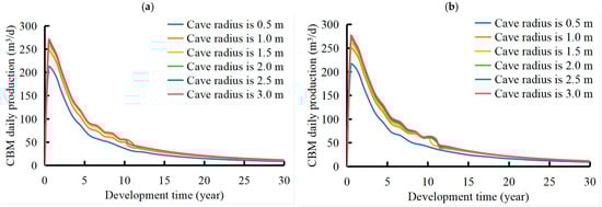 Further simulations reveal the impact of cave radius on the daily production of CBM, as illustrated in Figure 9. It can be observed that the effect of cave radius on the peak daily CBM production is similar to that of cave length; as both the cave radius and the number of cleats in the coal seam increase, the peak daily production of CBM continues to rise. However, there is a notable difference: in coal seams with a lower cleat density (Coal seam #1 and Coal seam #2), the influence of cavity radius on peak daily CBM production significantly diminishes once the radius exceeds 1 m.