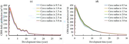 Effects of cave radius on productivity in different coal seams: (a) Coal seam 1#; (b) Coal seam 2#; (c) Coal seam 3#; (d) Coal seam 4#.