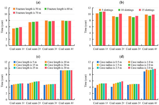 Stable production time of CBM with different stimulation methods: (a) Effect of fracture length; (b) Effect of slotting number; (c) Effect of cave length; (d) Effect of cave radius.
