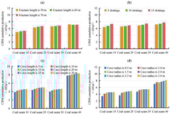 Cumulative production of CBM with different stimulation methods: (a) Effect of fracture length; (b) Effect of slotting number; (c) Effect of cave length; (d) Effect of cave radius.