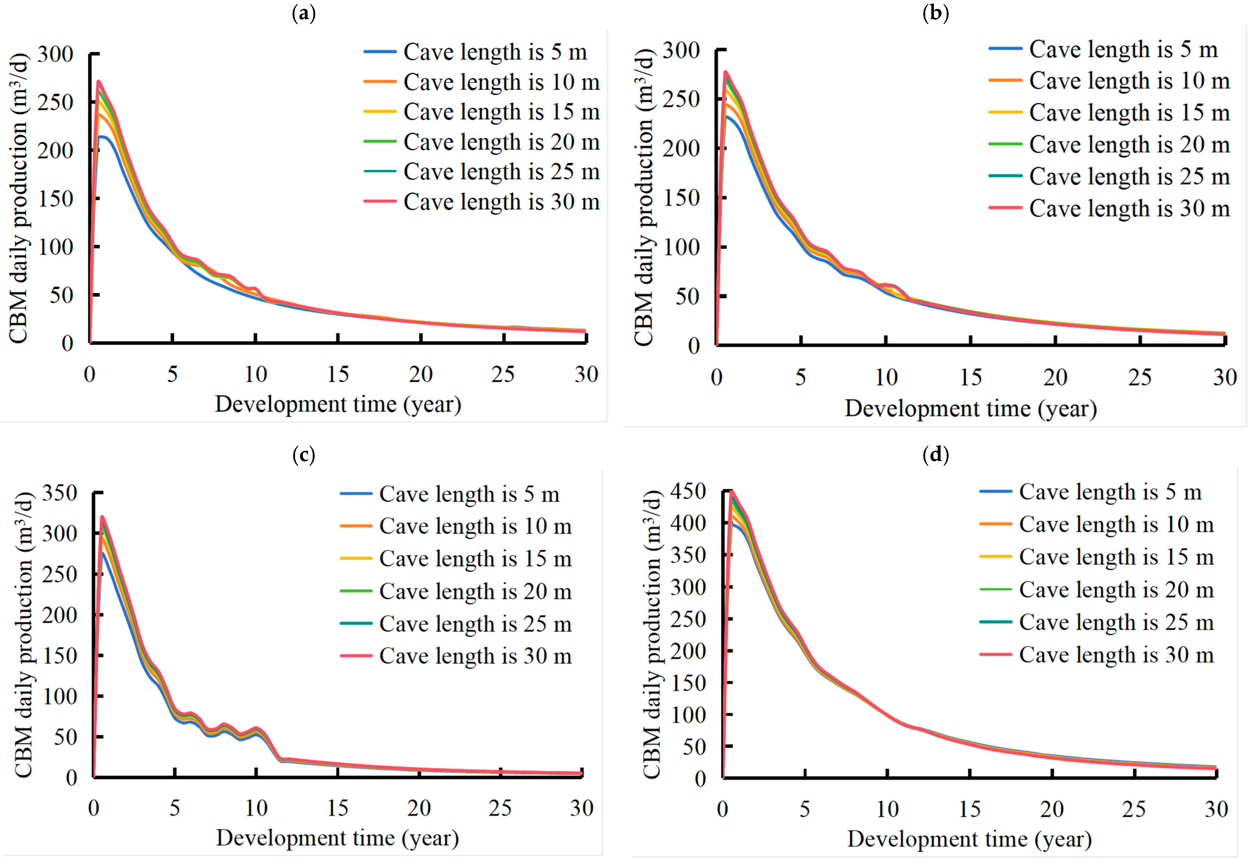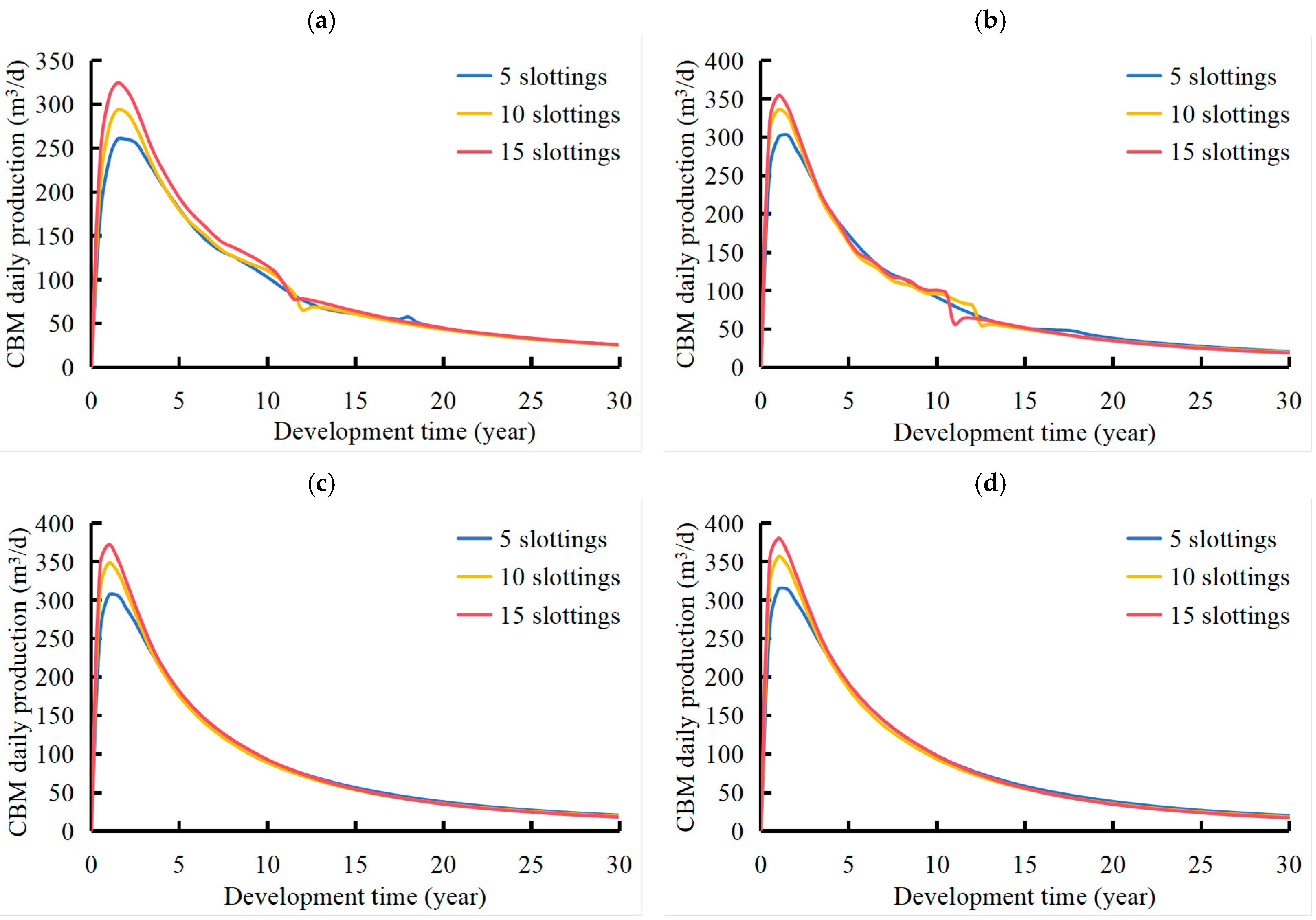 - Both the peak daily production and cumulative production of CBM can be enhanced by increasing the number of slots, as well as by increasing the length of hydraulic fractures and the dimensions (length and radius) of cavities. However, due to the random distribution of cleats within the coal seam, there can be significant variability in the impact of increasing cleat numbers on cumulative production. This is particularly true for the impact on cumulative production by slotting, which appears to be minimal.