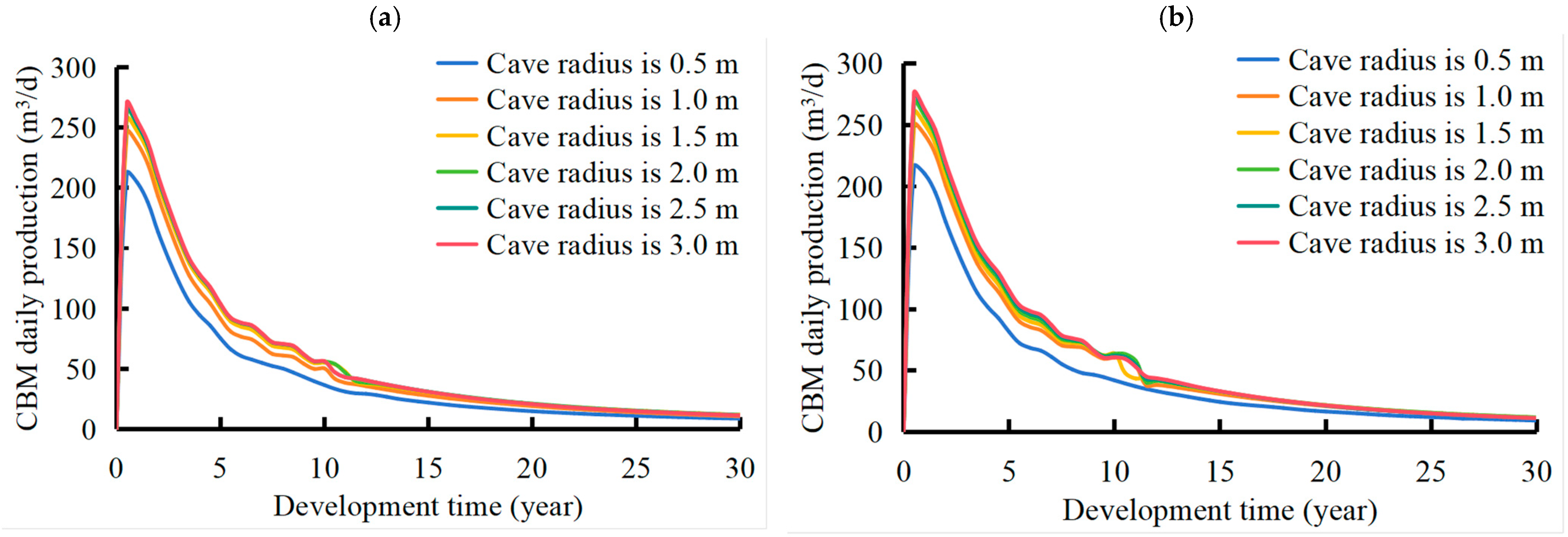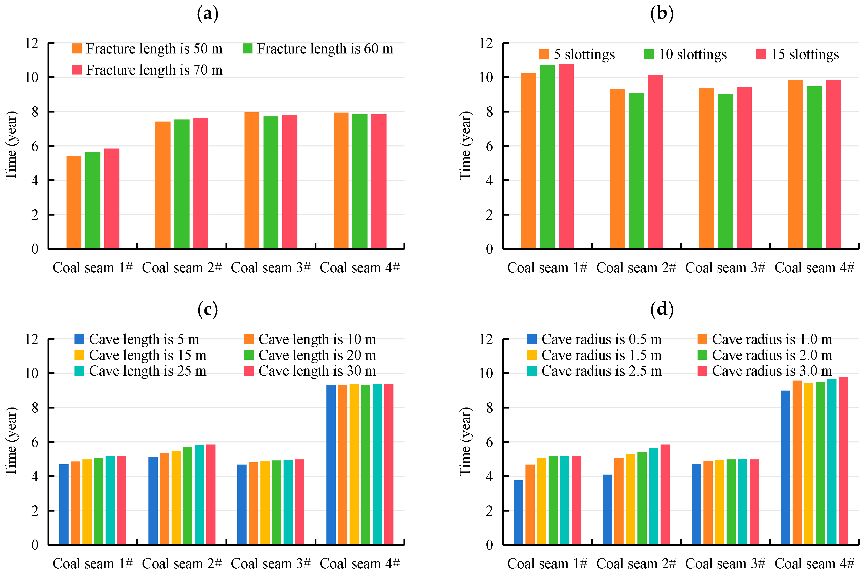 - Regarding the stable production period for CBM, in coal seams with 19 cleats, slotting results in the longest stable production time, about 10.57 years, followed by hydraulic fracturing, with cavity creation being the least effective, only 4.98 years. Conversely, in coal seams with a higher number of cleats, the stable production periods with cavity creation and slotting have little difference, about 9.47 years, whereas hydraulic fracturing is the least effective, only 7.86 years.