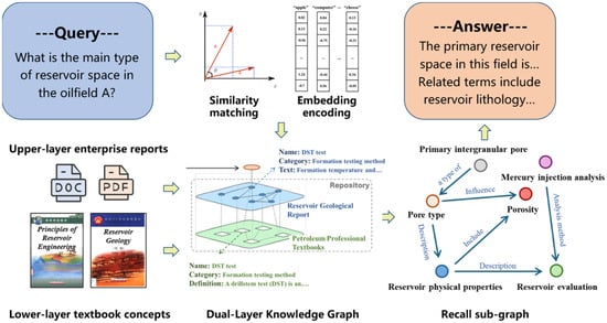 To enhance the accuracy and authority of large language models in petroleum exploration and development, this study proposes a dual-layer knowledge graph retrieval-augmented generation (GraphRAG) framework tailored for specialized engineering scenarios (Figure 1). Our method builds upon the open-source framework nano-graphrag [40] through deep customization and optimization. In particular, we integrate domain-specific knowledge graph construction with structured prompt design strategies, explicitly embedding semantic labels and graph paths into the prompts. This ensures that Q&A outputs achieve higher logical interpretability, improved terminology citation standardization, and better alignment with engineering discourse [36,37,38], which is particularly valuable for addressing multi-coupling problems in reservoir geology and engineering [41].