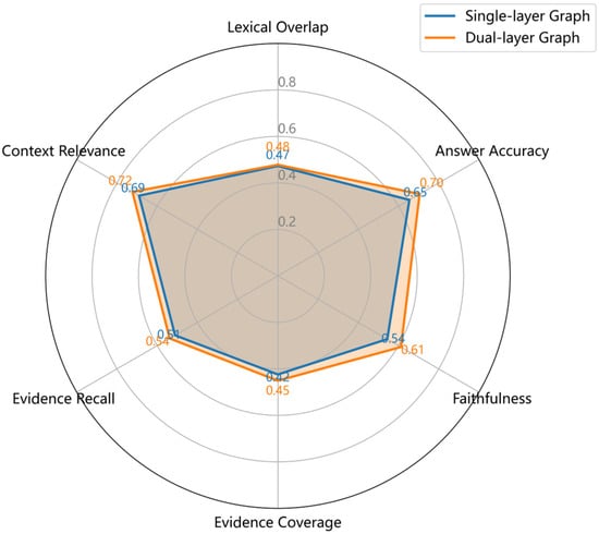 To systematically evaluate the performance gains introduced by the proposed du-al-layer graph mechanism, we compared it against a conventional single-layer graph across six evaluation dimensions under identical model and prompt configurations. The radar chart in Figure 3 provides a quantitative view of these results.