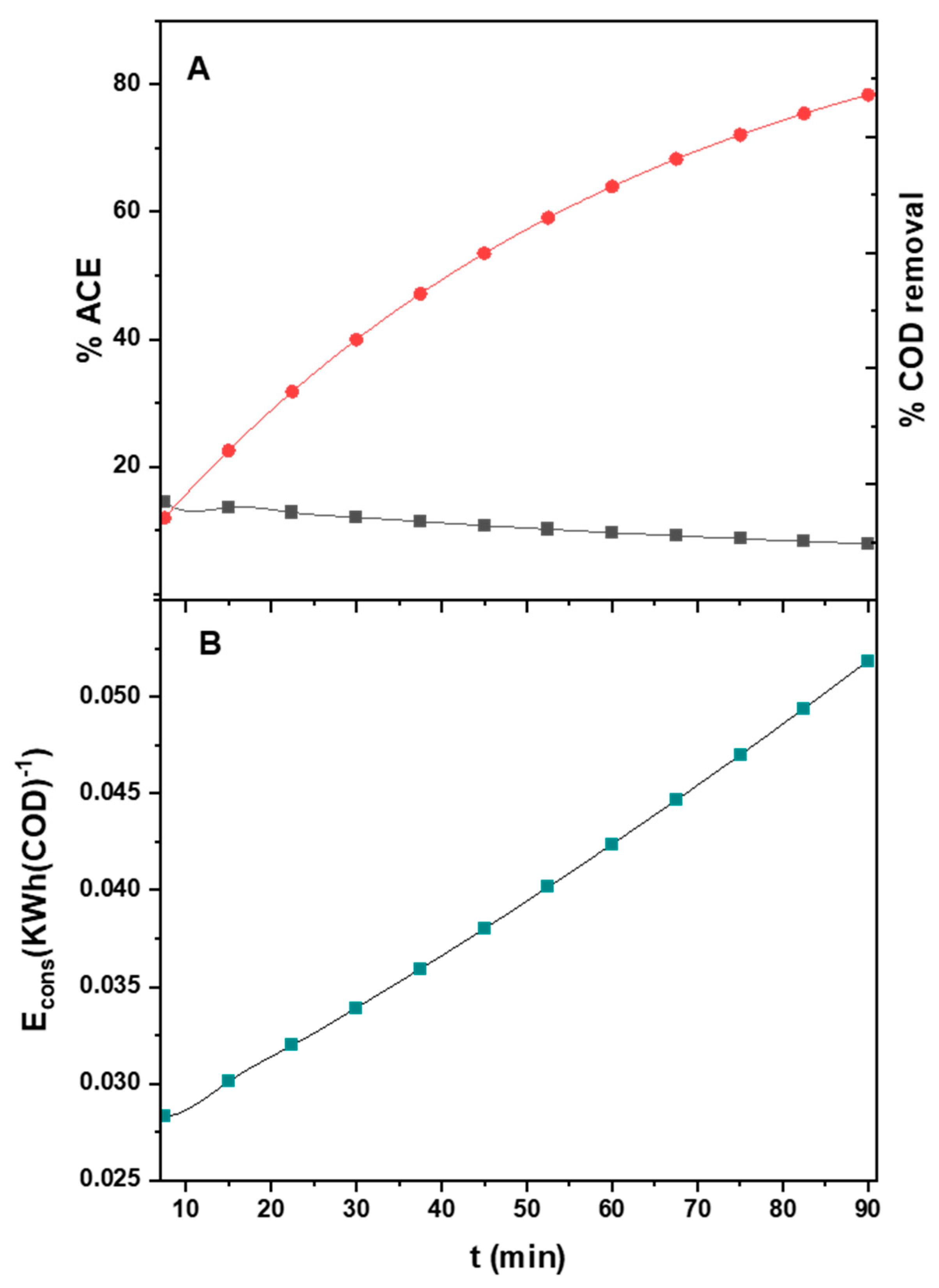 3.6. COD Removal, ACE Evaluation, and Energy Consumption