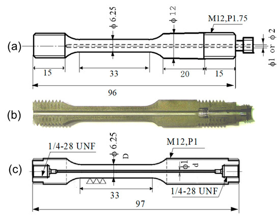 Hollow-type round tensile specimens were machined from the bars, and their outer diameter (D) in the gauge length was 6.25 mm, as shown in Figure 1. The hollow (hole) in the specimen was machined by an electro-discharge and wire-cut, and its diameter (d) was less than 2 mm. The maximum roughness (Rmax) of the surface of the hole was measured using a 3D laser scanning microscope and was approximately 8 μm [14,21].