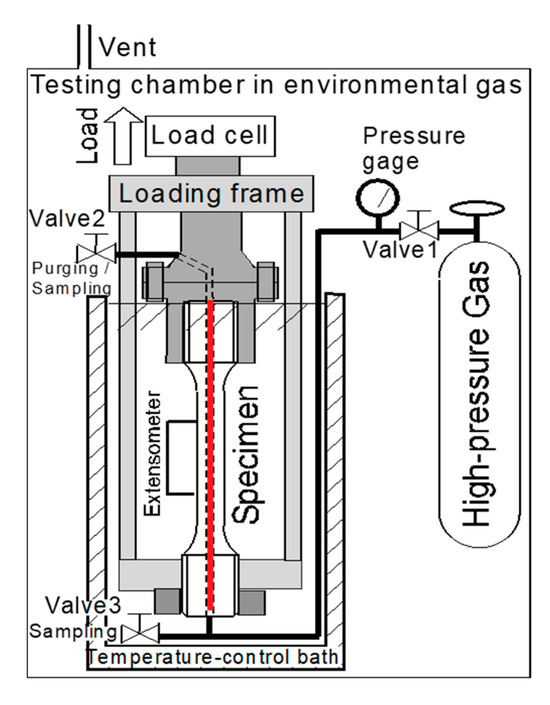 Schematic diagram of a mechanical properties testing method for a high-pressure hydrogen environment using a hollow specimen [19]. The red line in the center of the specimen is a hollow space that is filled with high-pressure hydrogen or an inert gas.